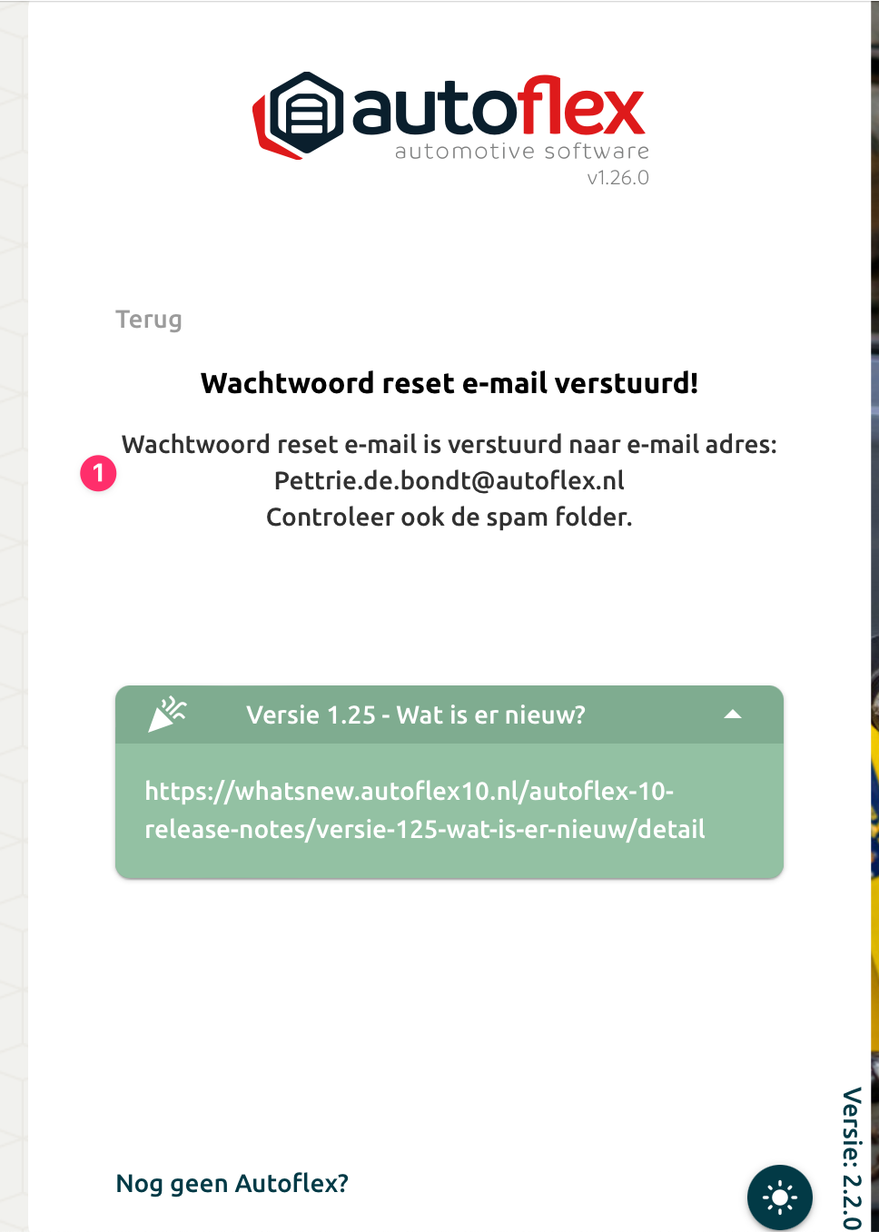Controleer dit mailadres en kijk vervolgens in die mailbox voor de reset mail. Mocht je geen mail hebben ontvangen neem dan contact op met de Servicedesk van Autoflex. |