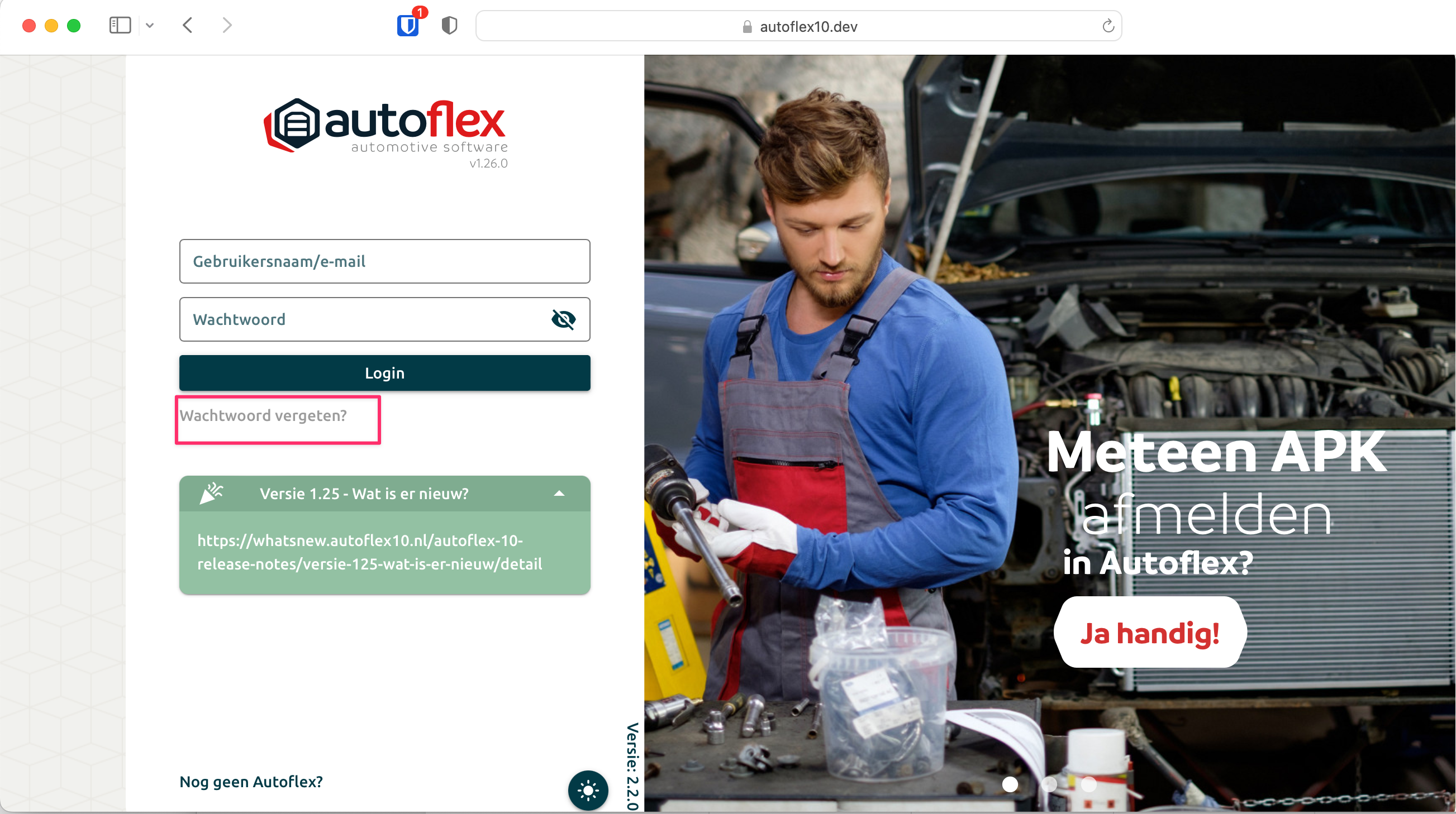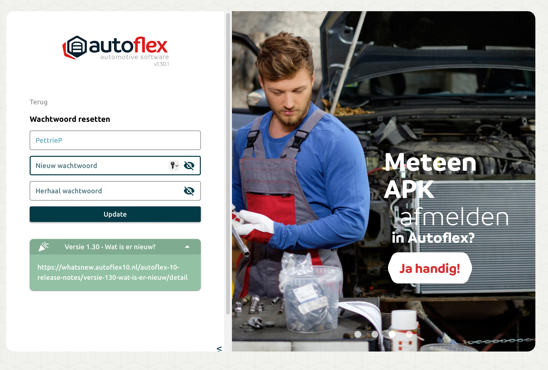 Via onderstaande stappen kun je gemakkelijk jouw wachtwoord aanpassen. Daarna kun je met het nieuw ingestelde wachtwoord weer verder werken in Autoflex.