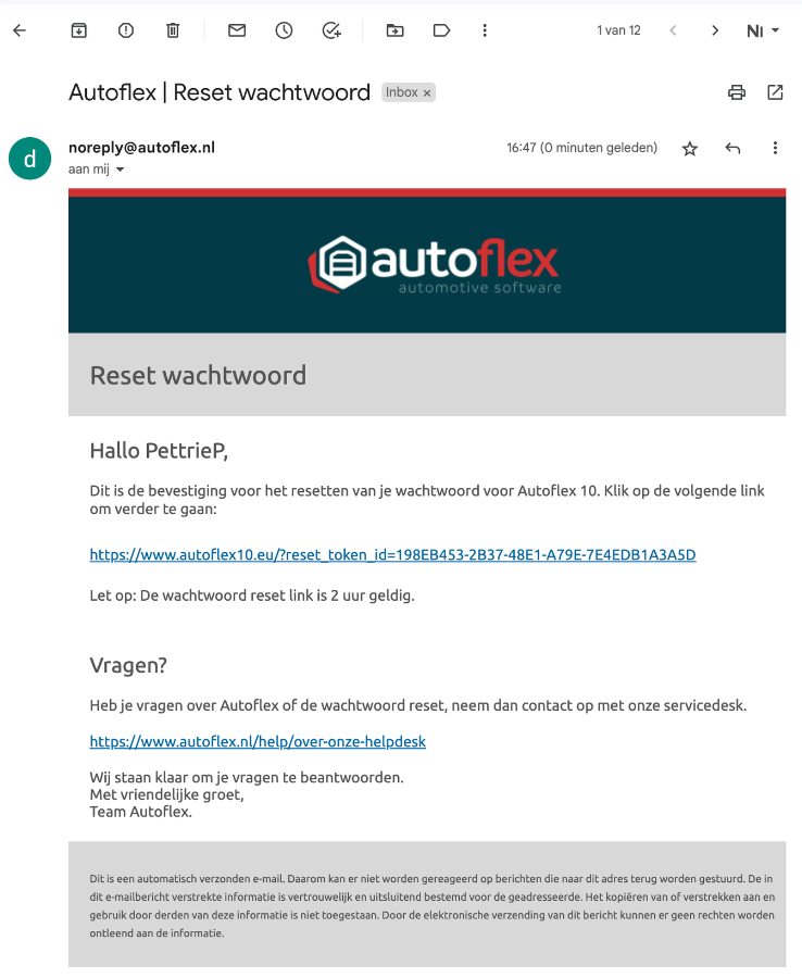 Controleer dit mailadres en kijk vervolgens in die mailbox voor de reset mail. Mocht je geen mail hebben ontvangen neem dan contact op met de Servicedesk van Autoflex. |