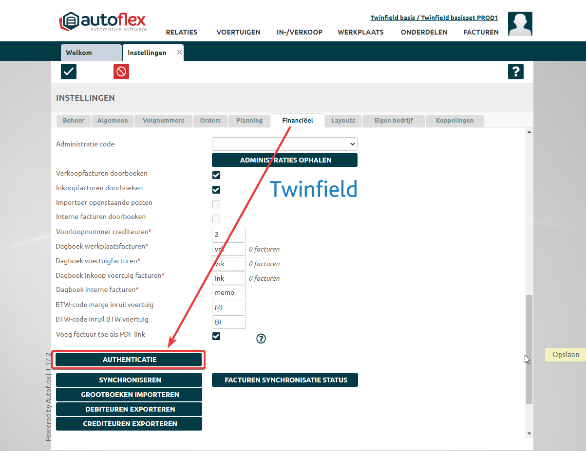 Tijdens de installatie van Autoflex is de koppeling met Twinfield gemaakt. Voor het maken van de koppeling met Twinfield moet er geauthentiseerd worden. Als dit opnieuw gedaan moet worden moeten onderstaande stappen worden uitgevoerd: