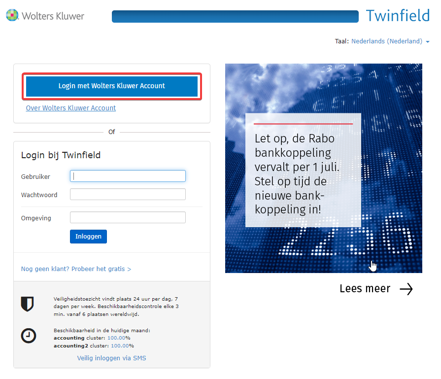 Klik vervolgens op de knop 'Authenticatie'. Je krijgt nu het inlogscherm van Twinfield te zien. Klik hier op 'Login met Wolters Kluwer Account'. |