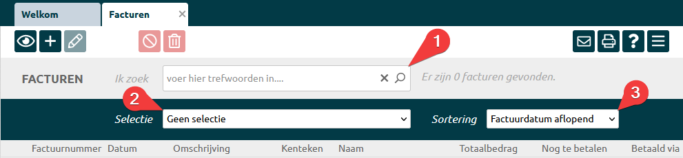 In het facturen scherm kan gezocht worden aan de hand van:  Hoe het zoekveld opheffen:   |