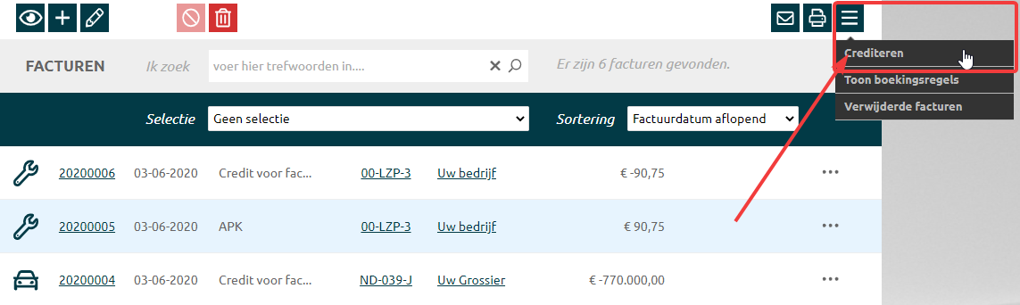 De geselecteerde factuur kun je crediteren via het menu rechtsboven. Je kunt niets aanpassen aan de credit, de factuur wordt volledig gecrediteerd.  |
