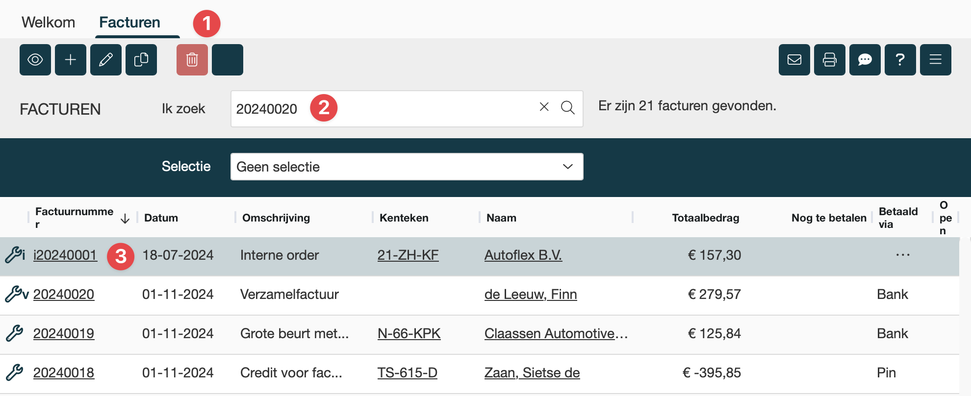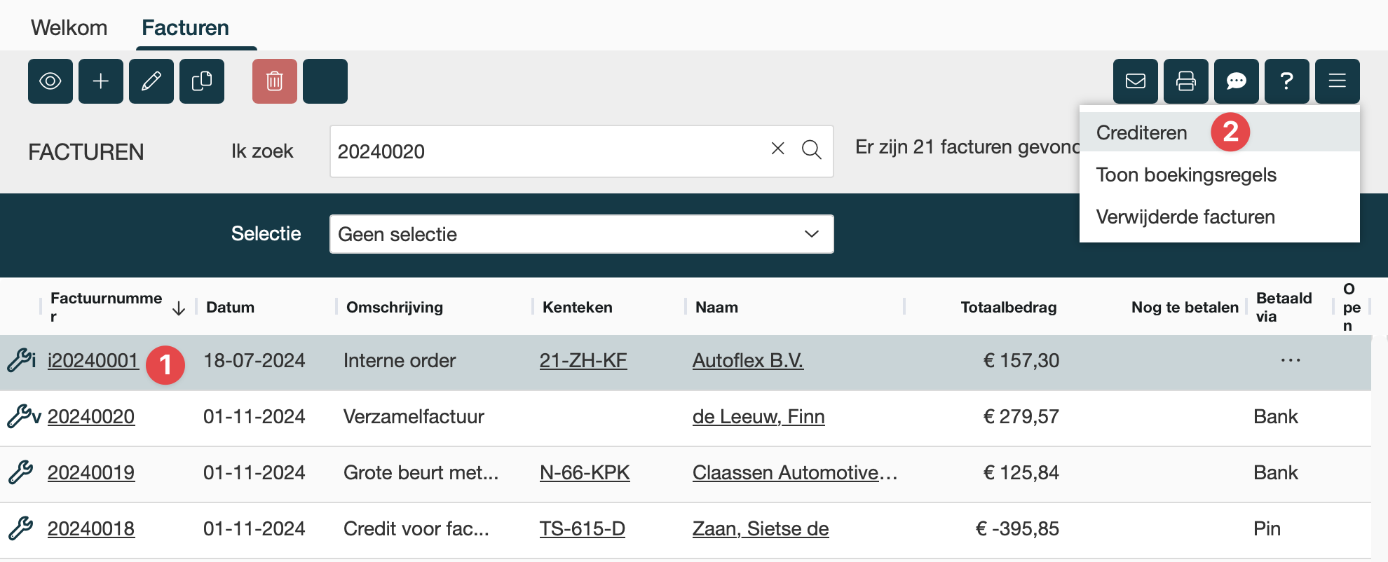 Nu zie je een overzicht van alle gemaakte facturen. Zoek en vind de factuur die je wilt crediteren. |