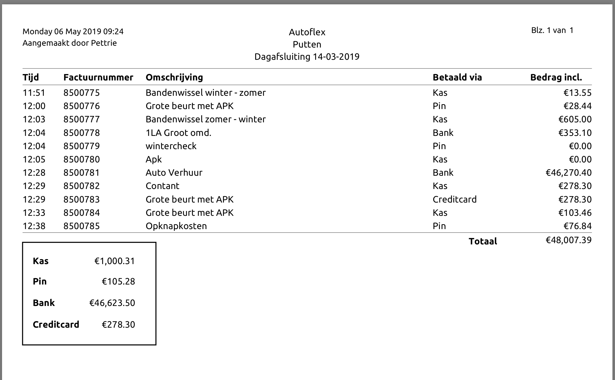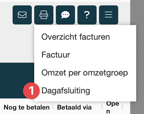 Open het rapport via: Facturen → Afdrukken → Dagafsluiting.