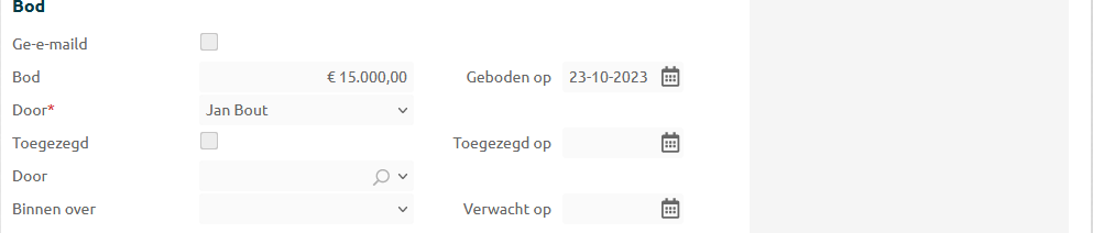 Bij elke bieding kun je aangeven wanneer deze is gedaan en welk personeelslid deze heeft ingevoerd. Wanneer je bieding wordt geaccepteerd, kun je de datum van goedkeuring en de contactpersoon die het bod heeft geaccepteerd registreren. Tevens heb je de mogelijkheid om meteen de afhaaldatum van het voertuig vast te leggen.