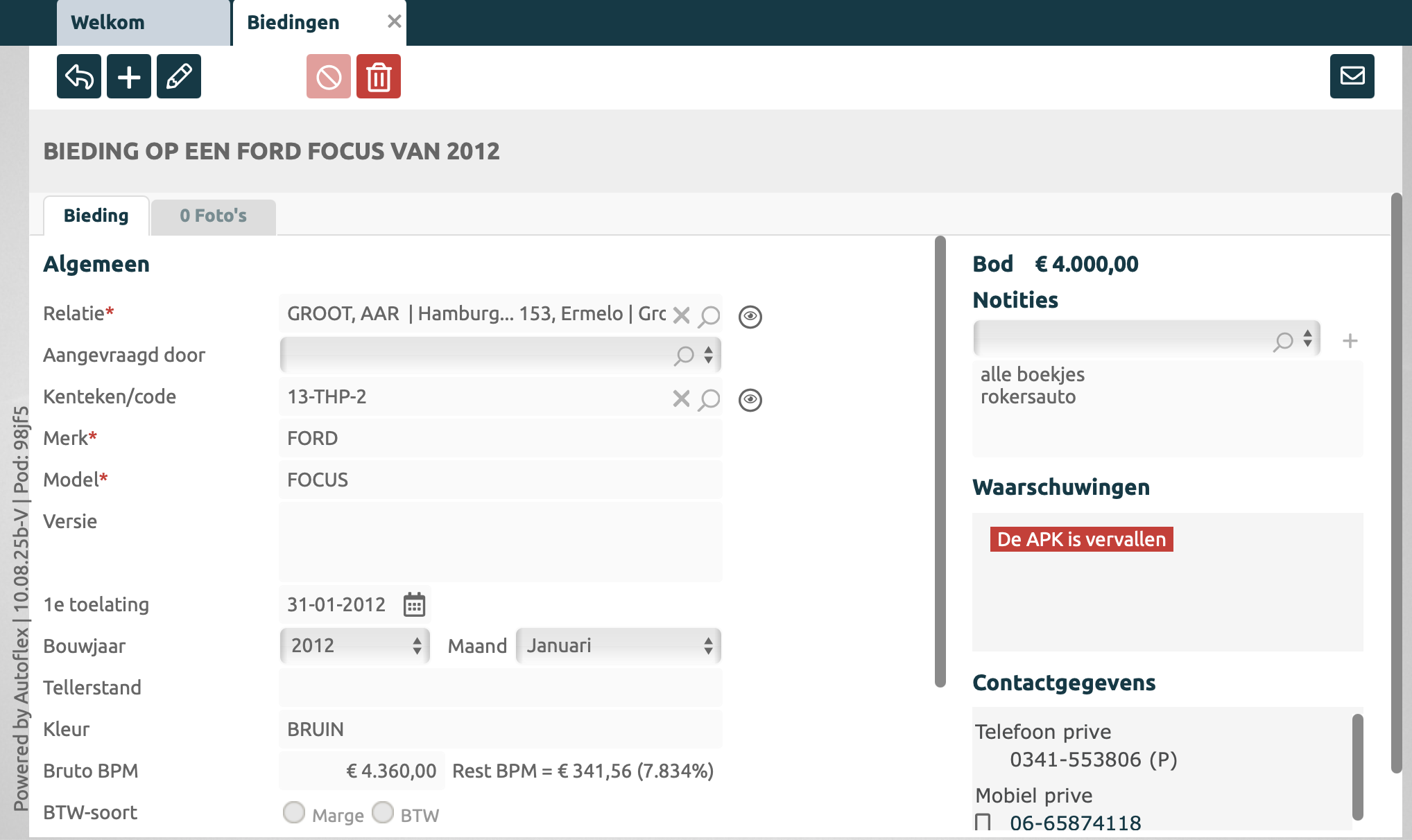 In Autoflex kun je al je biedingen bijhouden die je hebt uitgebracht op voertuigen, bijvoorbeeld via advertenties op Marktplaats. Hierbij registreer je informatie over de eigenaar of dealer, basisgegevens van het voertuig, zoals kenteken, merk, model, kilometerstand, en meer, evenals je eigen bod.