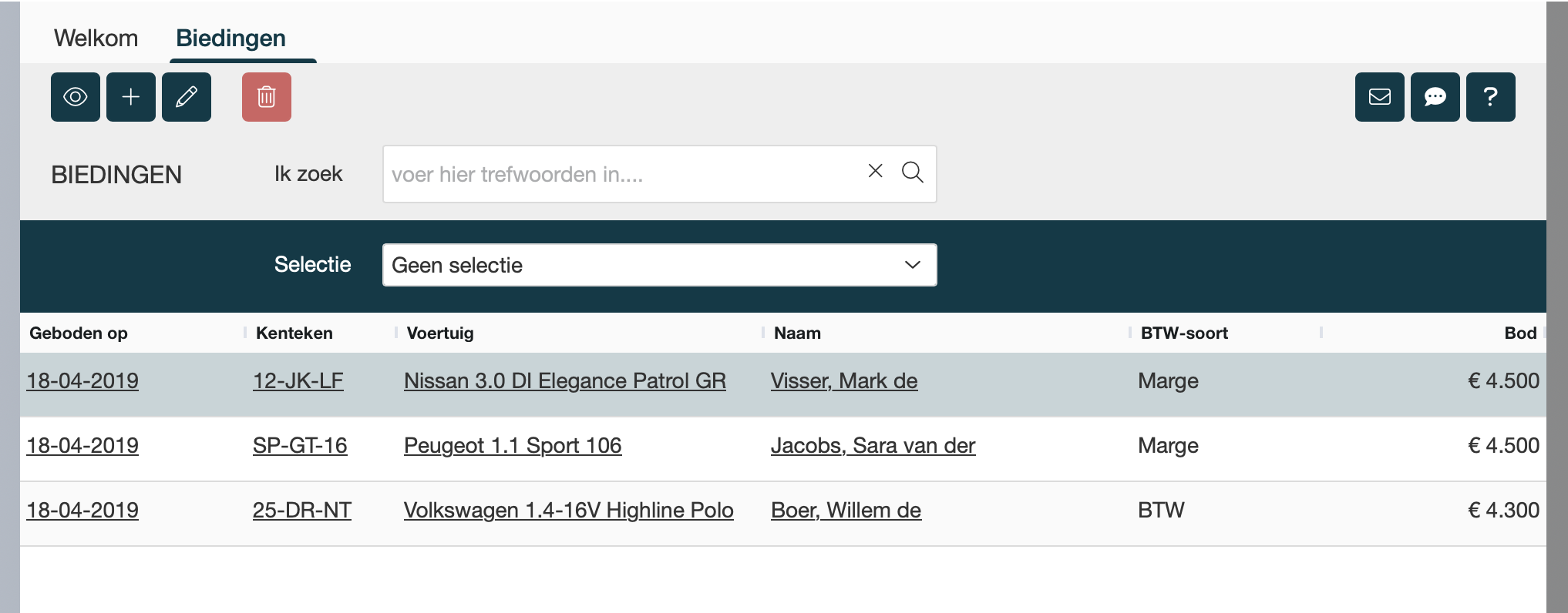 Klik op het plusje om een nieuwe bieding te registeren. |
