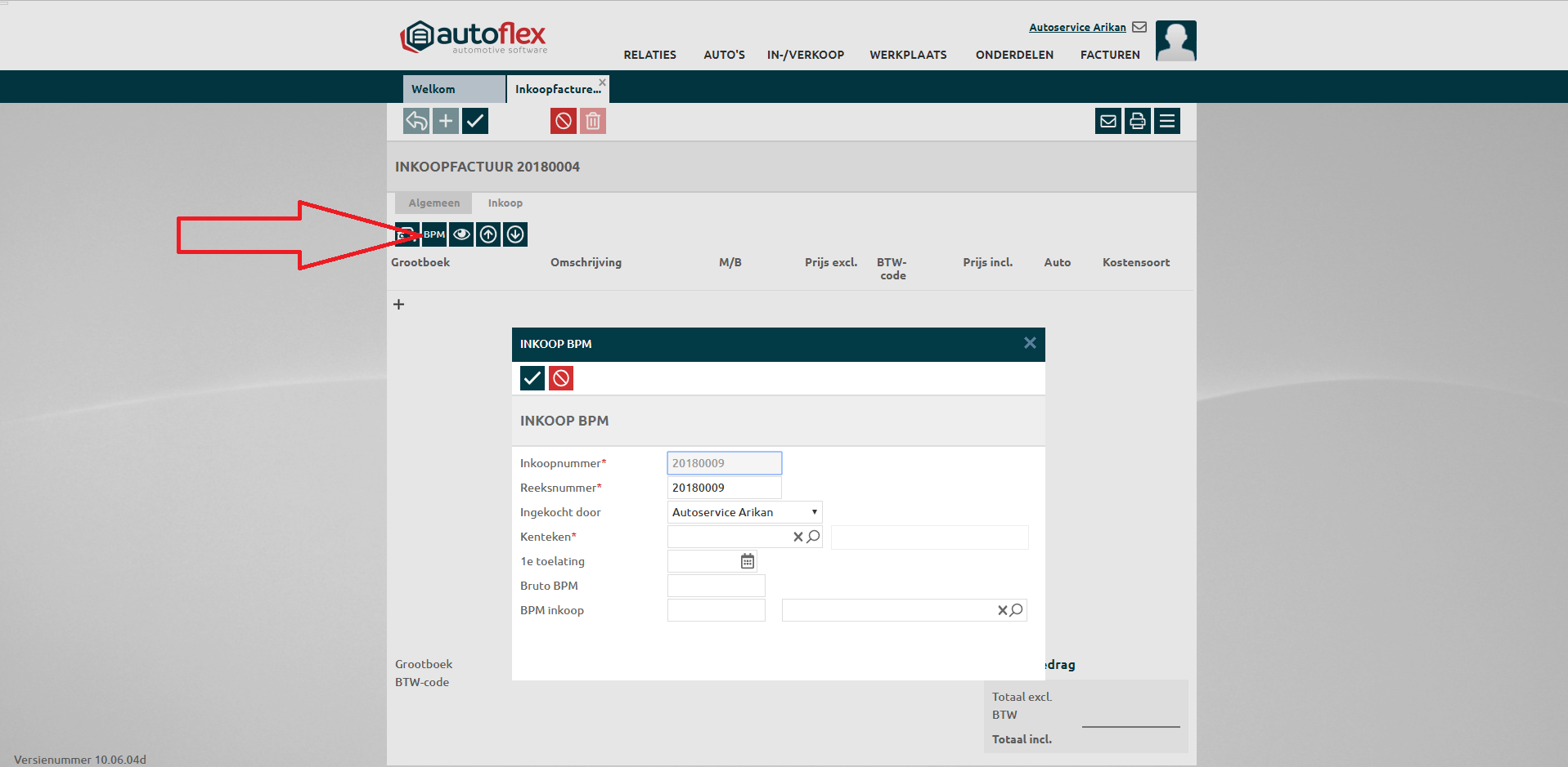 Na het invoeren factuurnummer en relatie ga je naar het tabje 'Inkoop' en daar klik je op het plusje en daarna op BPM.