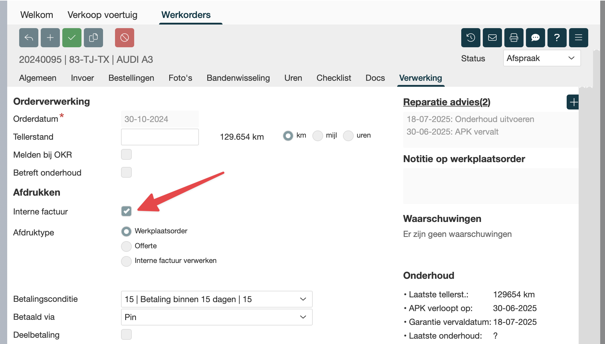 Interne werkorder om voertuig rijklaar te maken