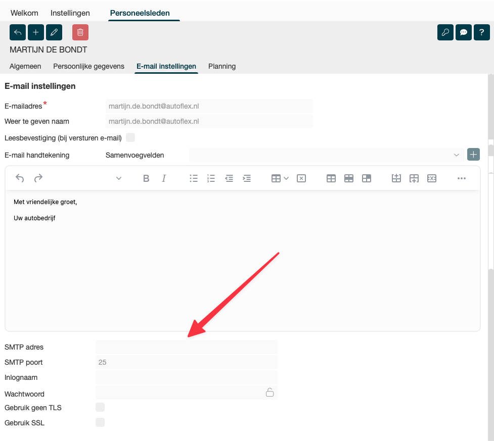 Kies je voor onze Sendgrid oplossing dan regelen wij de smtp gegevens voor je. Deze velden zie je dus ook niet bij het personeelslid. Alleen het emailadres, naam en de handtekening moet je zelf invullen.
