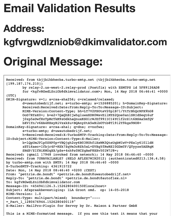 Zodra de email door Autoflex 10 is verstuurd kun je op de dkimvalidator.com website de controle doen