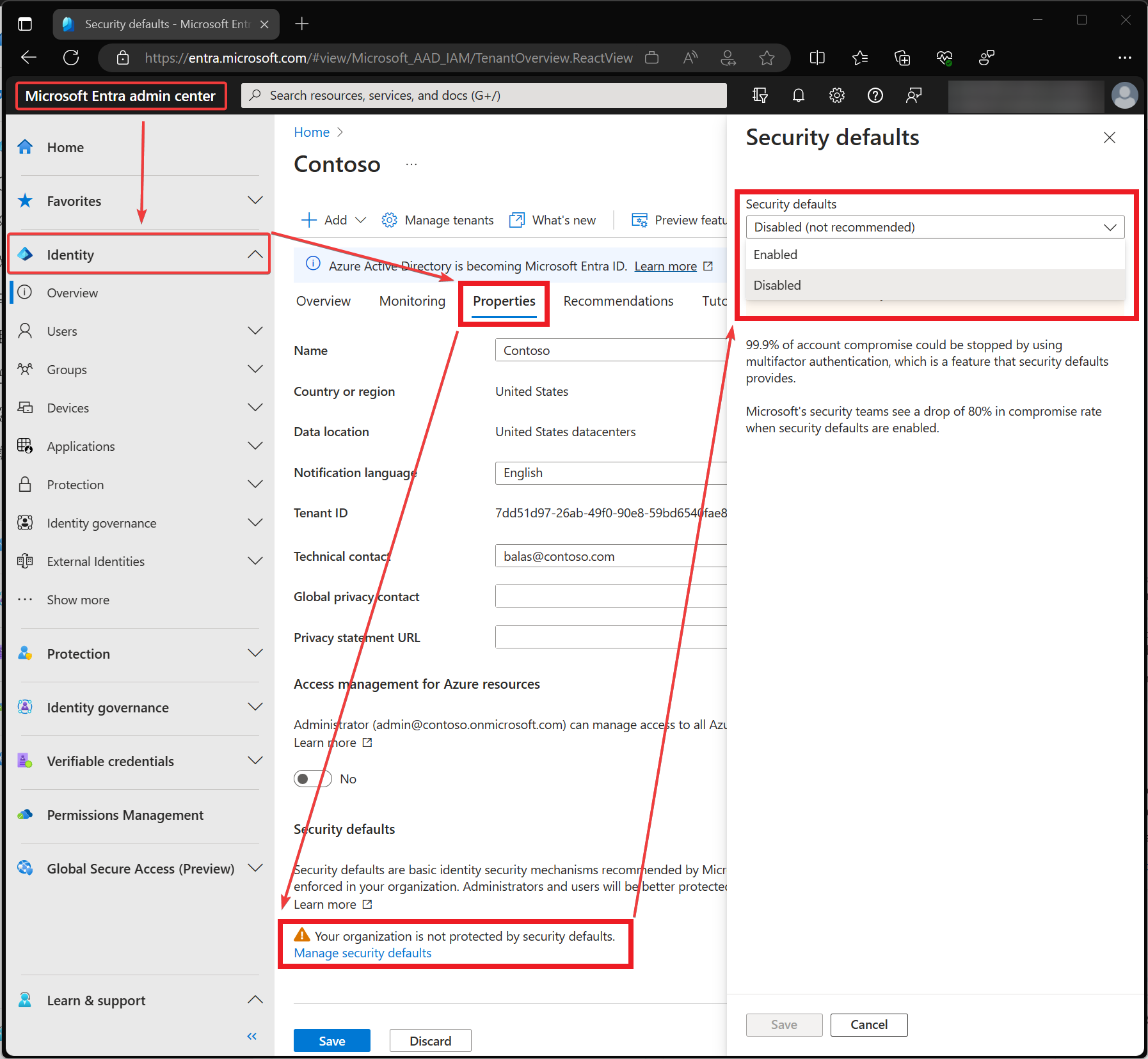 Ga in Microsoft Entra admin center/ Identity / Properties, kies daar Manage security defaults en zet Enabled Security defaults op Disabeld |