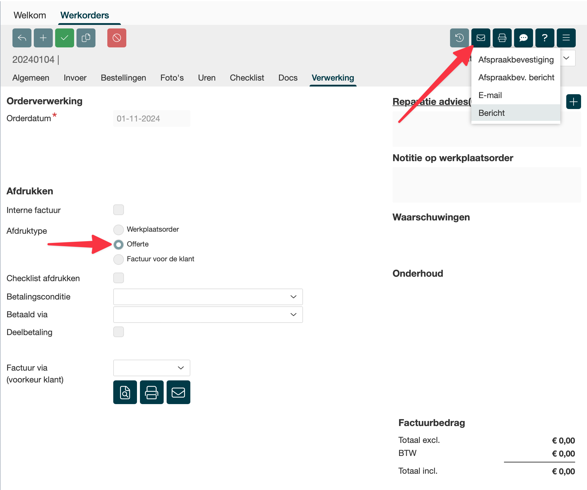7 | werkorder - offerte | menu: werkplaats > sub: werkorders > item: werkorder > tab: verwerking: offerte > knop: e-mail > Bericht | 7,4, 15 |