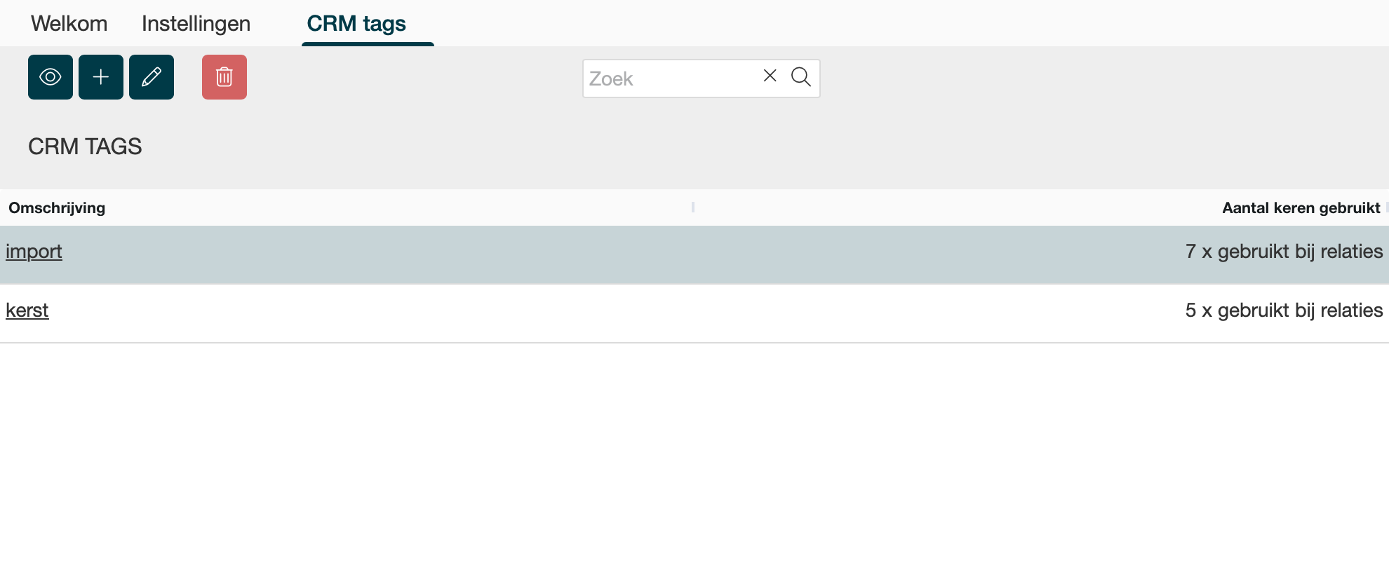 Overzicht van toegevoegde CRM tags en hoevaak deze tag bij relaties is gebruikt.