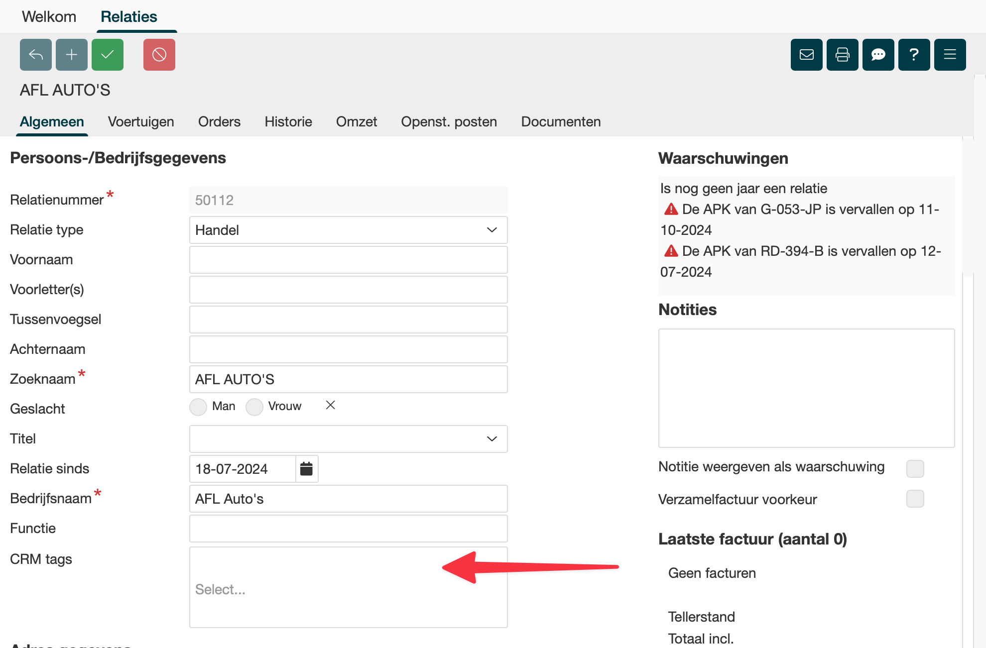 CRM tags bij de relatie |