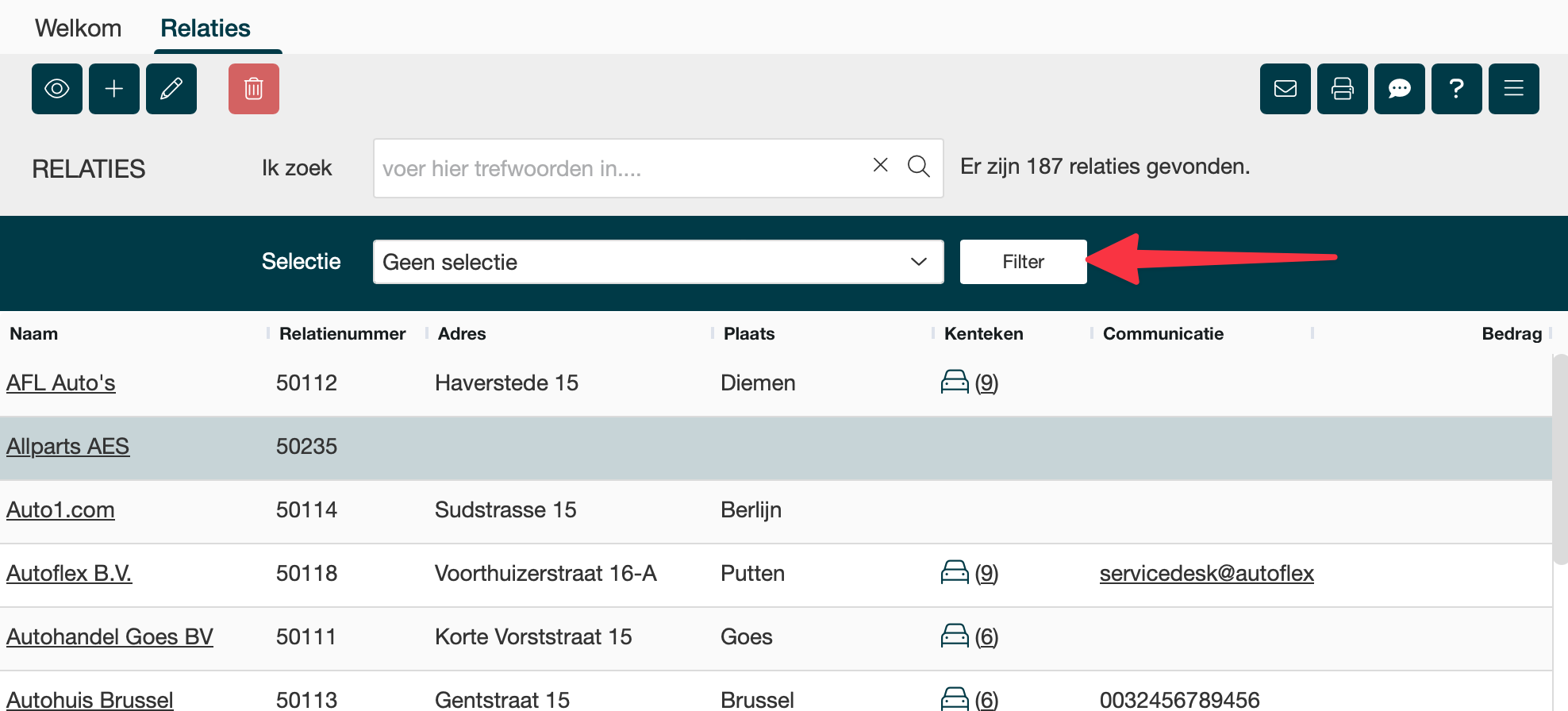 De filter knop filtert relaties op de reeds bestaande lijst in het overzicht. Wil je filteren op alle relaties, zorg dan dat je geen selecties hebt gemaakt en het zoekveld leeg is.