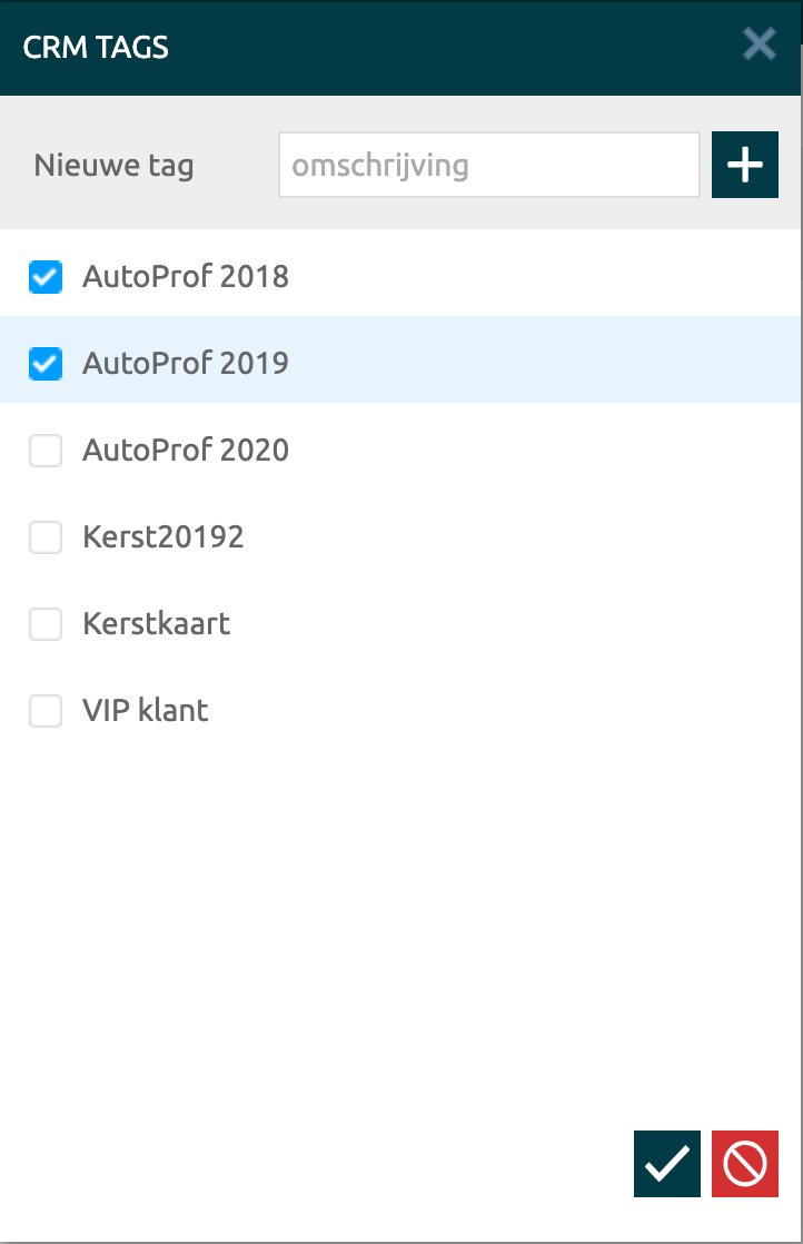 Door te klikken op het CRM tag veld of op het vergroot glas opent een dialoog om CRM tags toe te voegen, te selecteren of te de-selecteren.