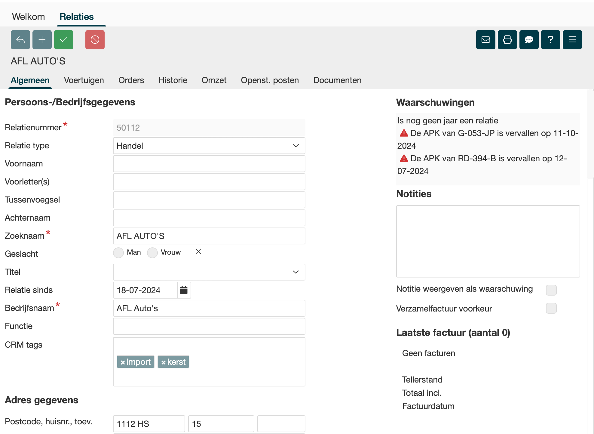 Bij een relatie op het tabblad Algemeen kun je de reeds bestaande CRM tags koppelen of direct nieuwe aanmaken welke voor alle relaties binnen je omgeving beschikbaar zijn.