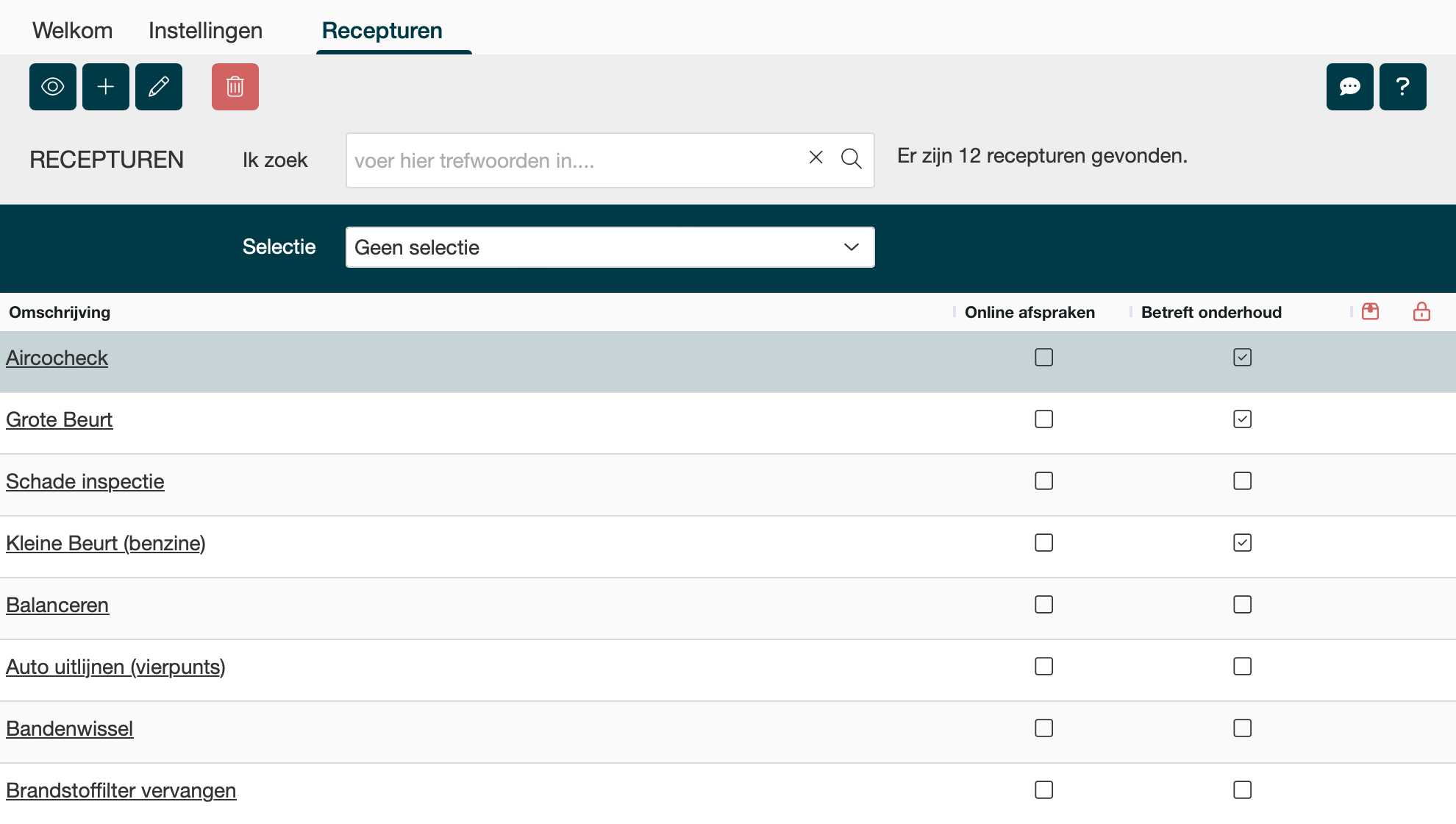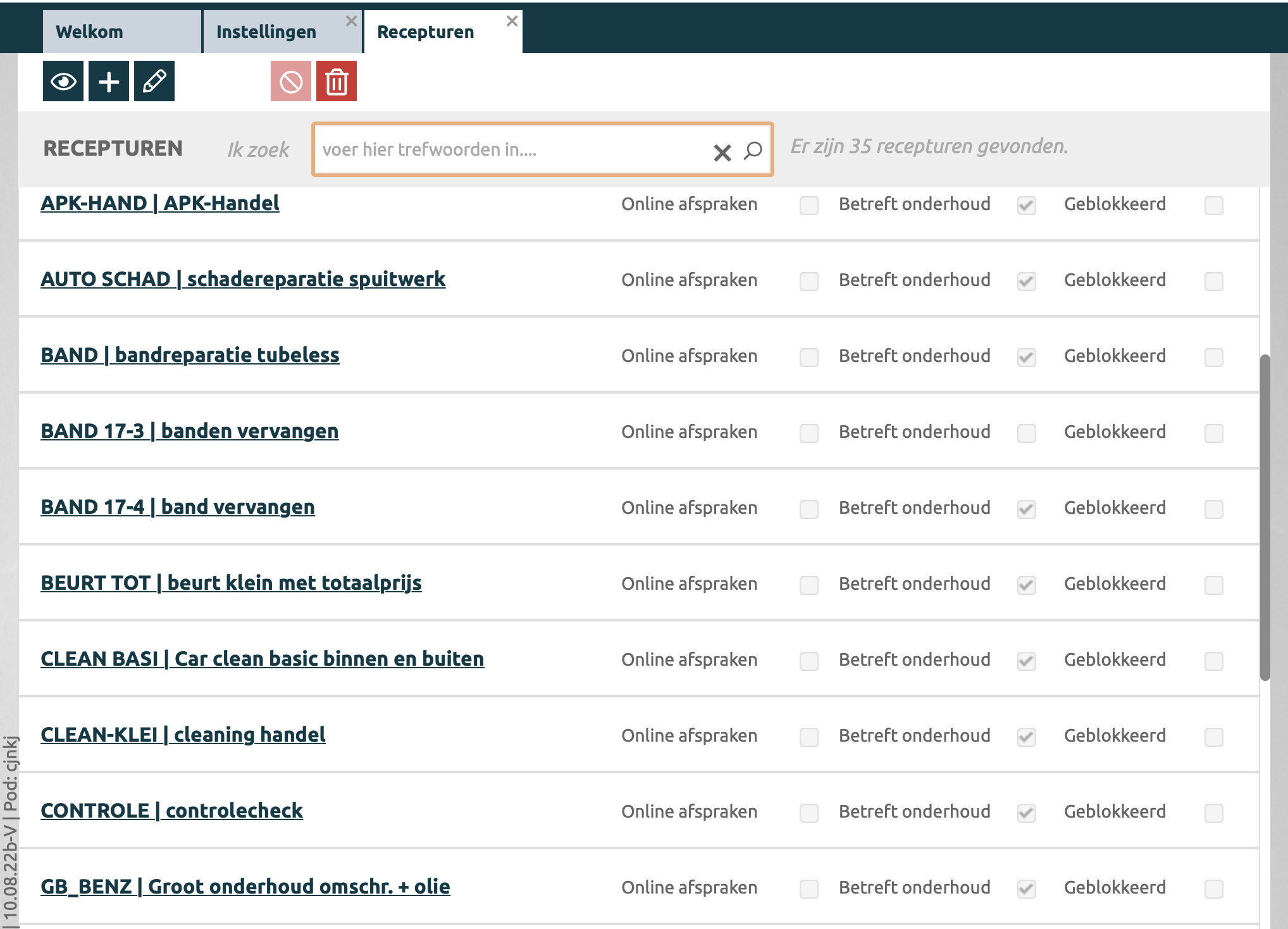 Open de recepturen via Profielicoon / Instellingen / (tabblad) beheer / Recepturen.