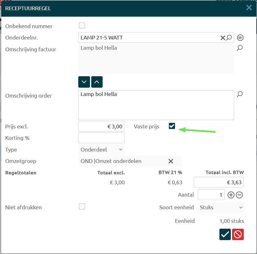 Vaste prijs = Maakt prijs aanpasbaar en zet deze vast voor dit receptuur