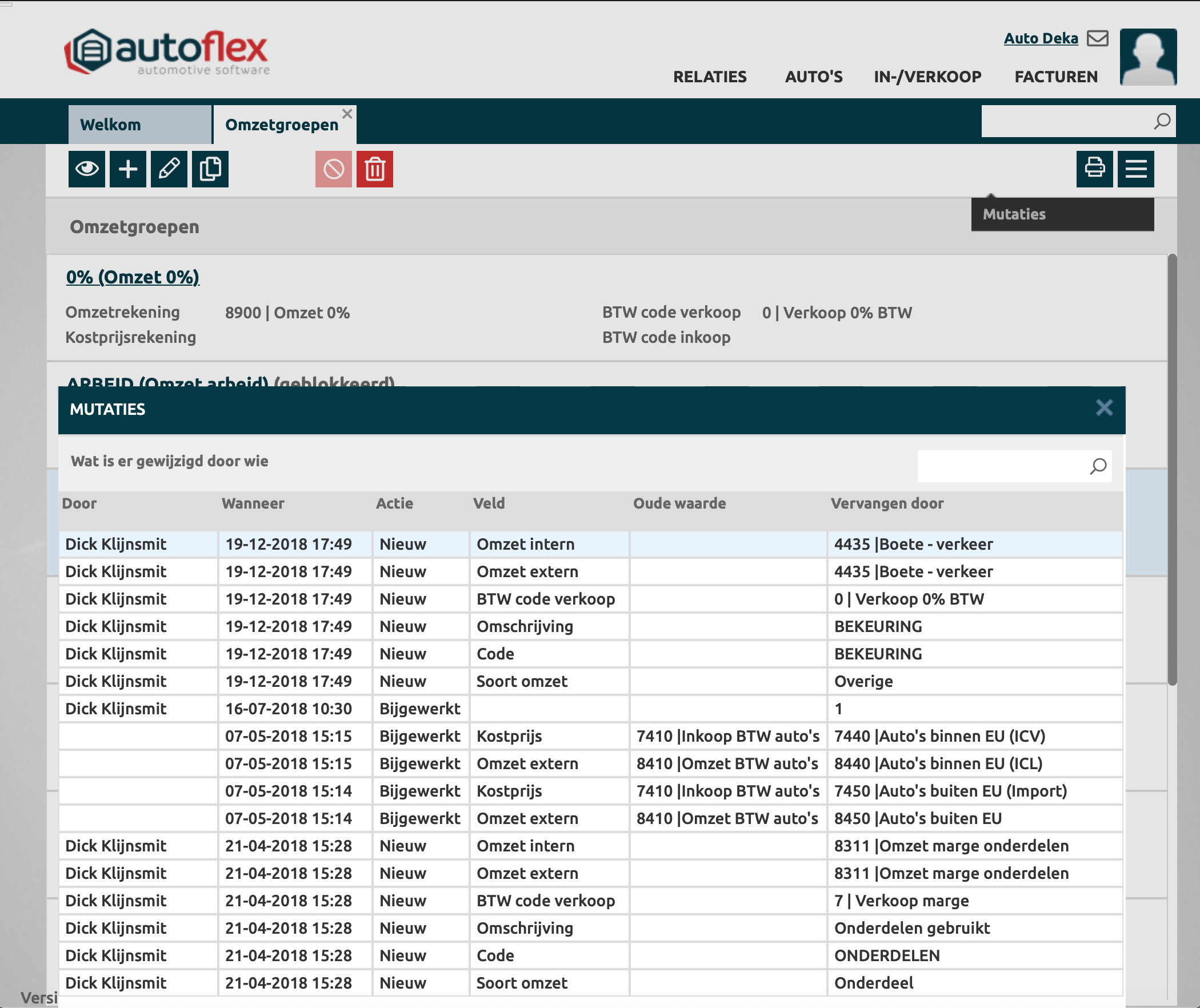 Het scherm mutaties toont alle mutaties die hebben plaats gevonden op de omzetgroepen, om zo in te zien wie de wijzigingen heeft doorgevoerd.