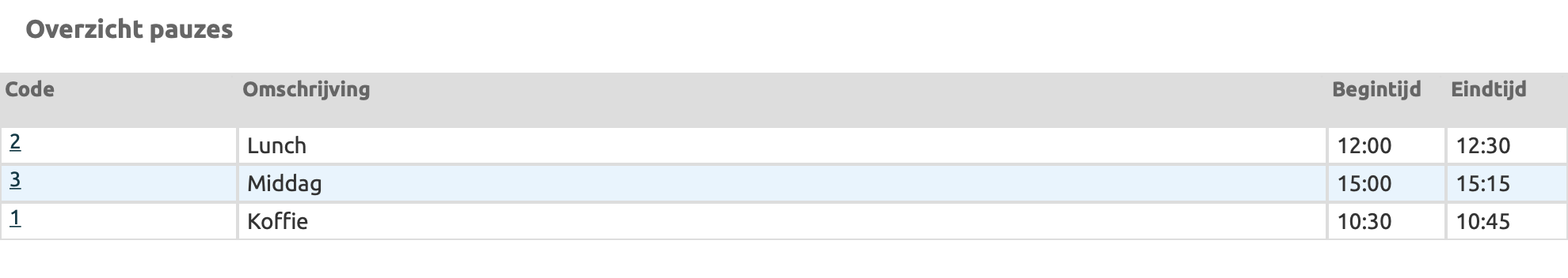 Een complete dag met daarin de standaard 3 pauzes getoond. Een werkdag van 8:30 uur met in totaal 3 pauzes geeft een werktijd van 7:30 uur |