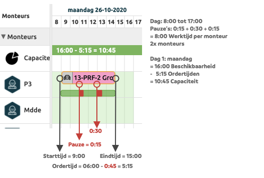 Planning met capaciteit De capaciteit balk toont: beschikbare tijd - gewerkte tijd = capaciteit |