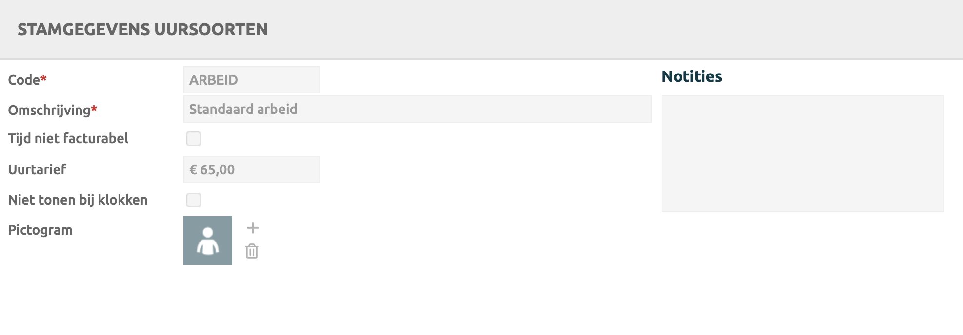 Dit pictogram wordt in de workflow getoondNotities = interne beschrijving van de uursoort