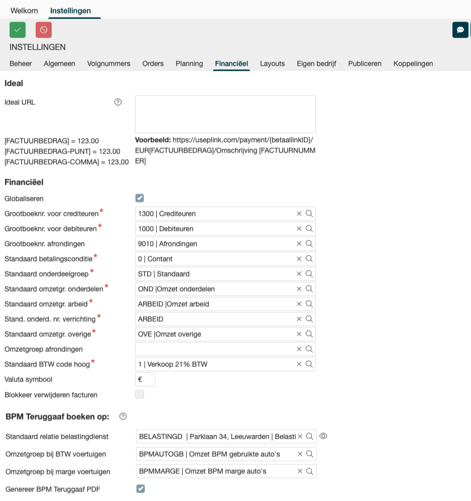 Instellingen die te maken hebben met de financiën binnen Autoflex