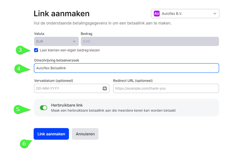 Je hebt een abonnement nodig bij Mollie, waarmee je een eigen betaallink kunt genereren.