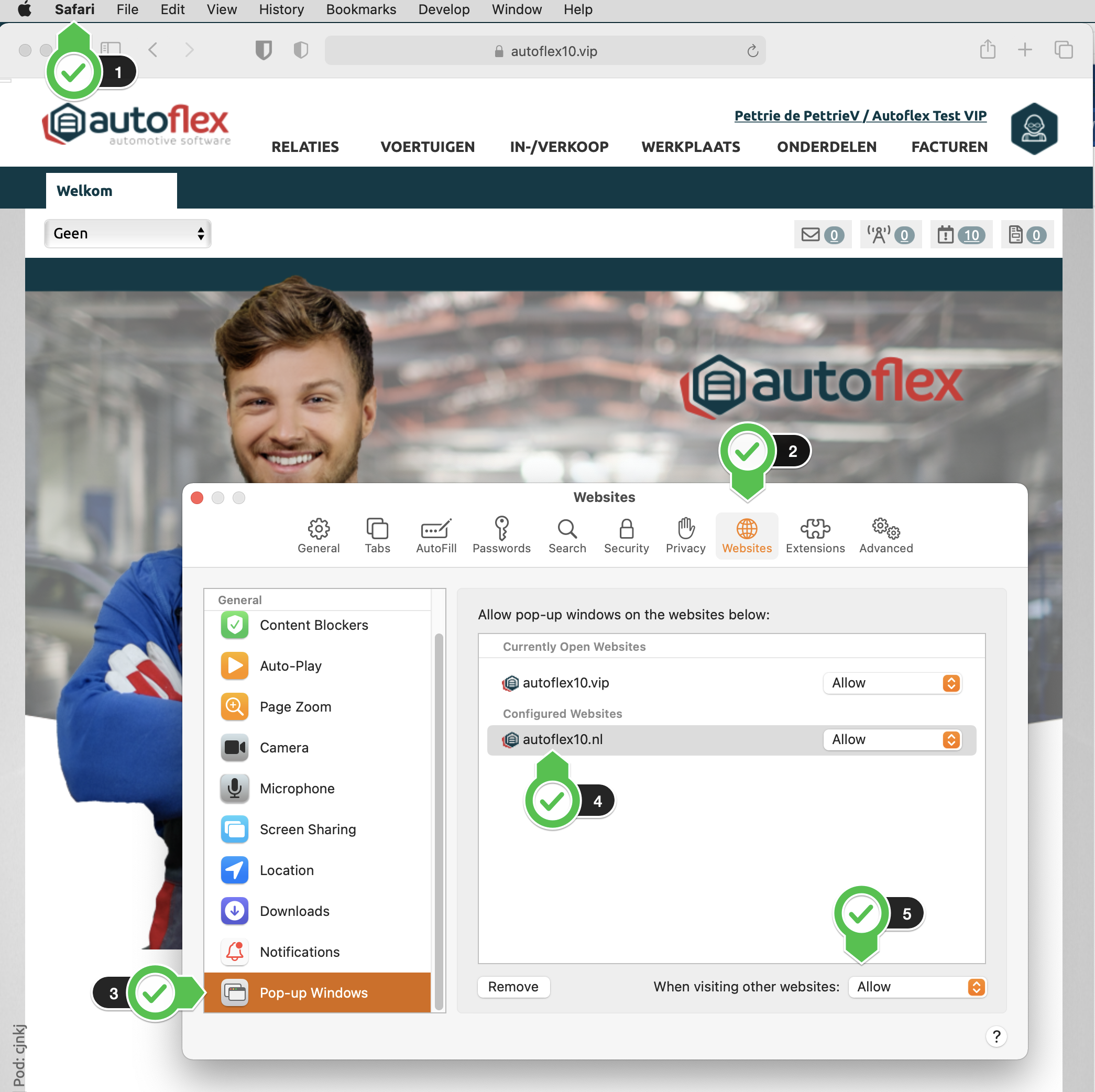 4. On de lijst van websites, kies de Autoflex10.nl website en laat popups toe
