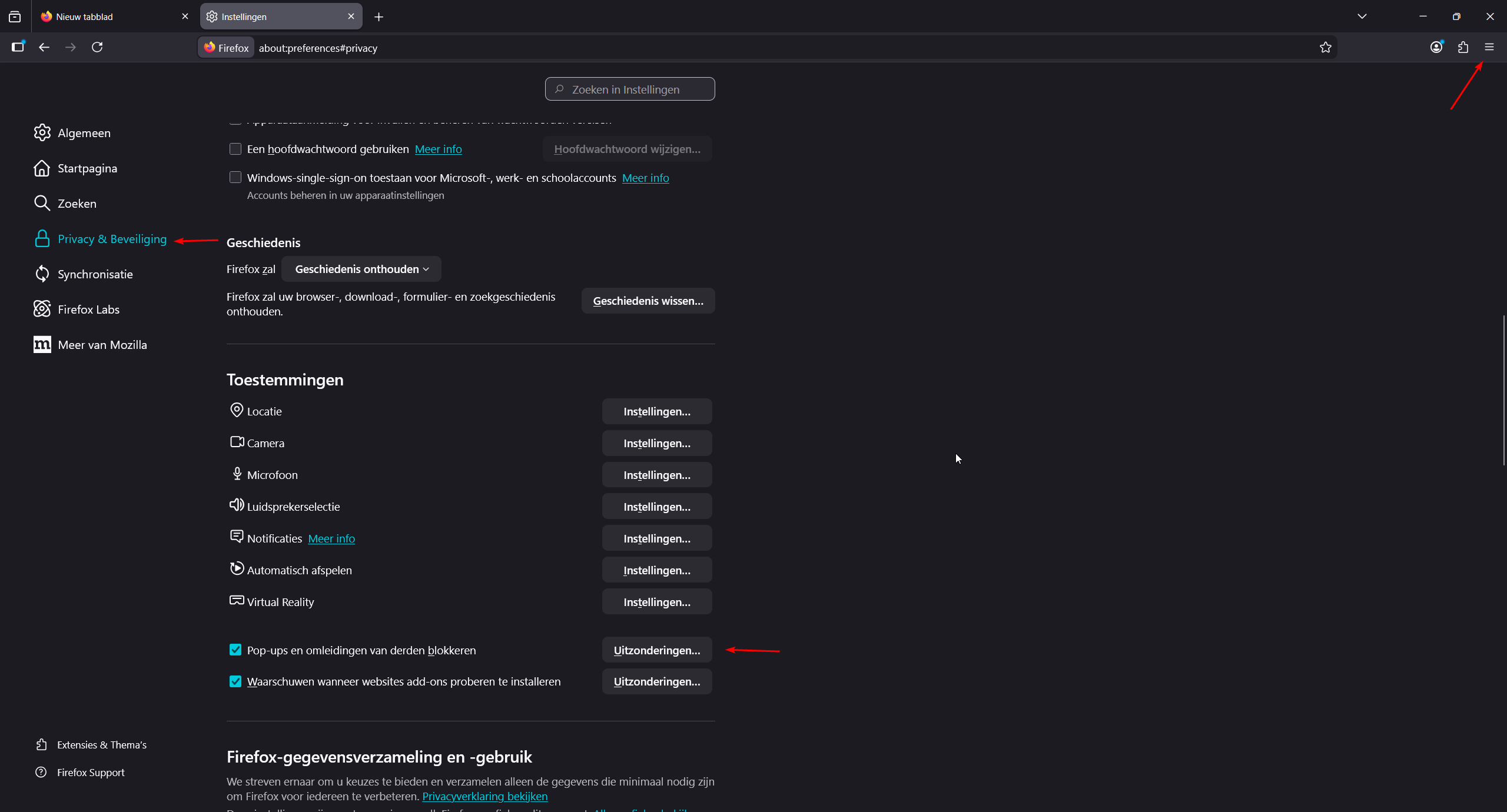 Toestemmingen, waar je pop-ups kunt blokkeren, toestaan per site, of de functie helemaal uit kunt schakelen. Voor een strengere blokkering, die ook geavanceerdere pop-ups tegenhoudt, kun je een add-on installeren, zoals "Popup Blocker (strict)", vanuit de Firefox Add-ons store.