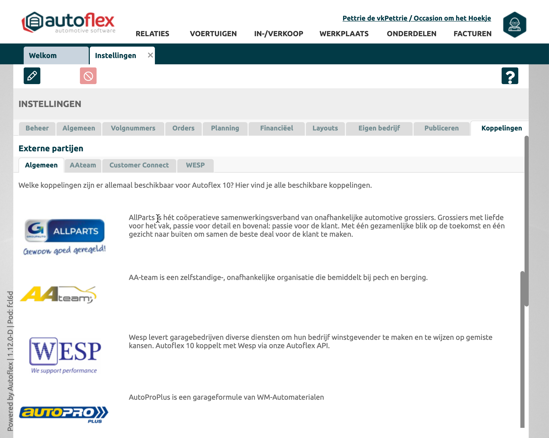 Autoflex 10 heeft de volgende koppelingen met externe partijen: