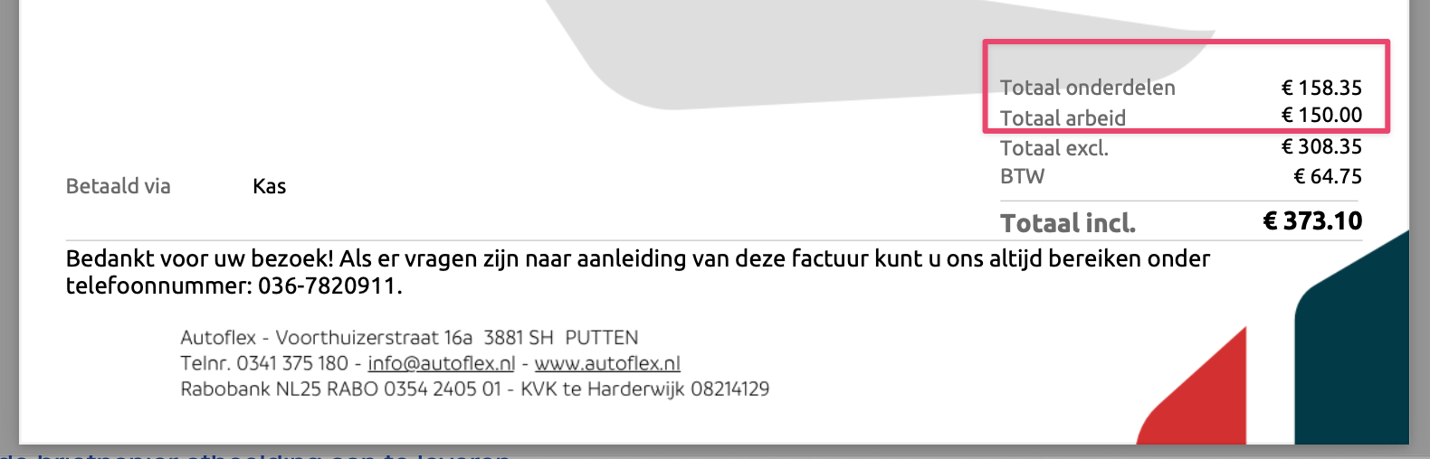| checkbox Toon subtotalen van arbeid en onderdelen onderaan op de order/factuur, zie ook voorbeeld hieronder | |