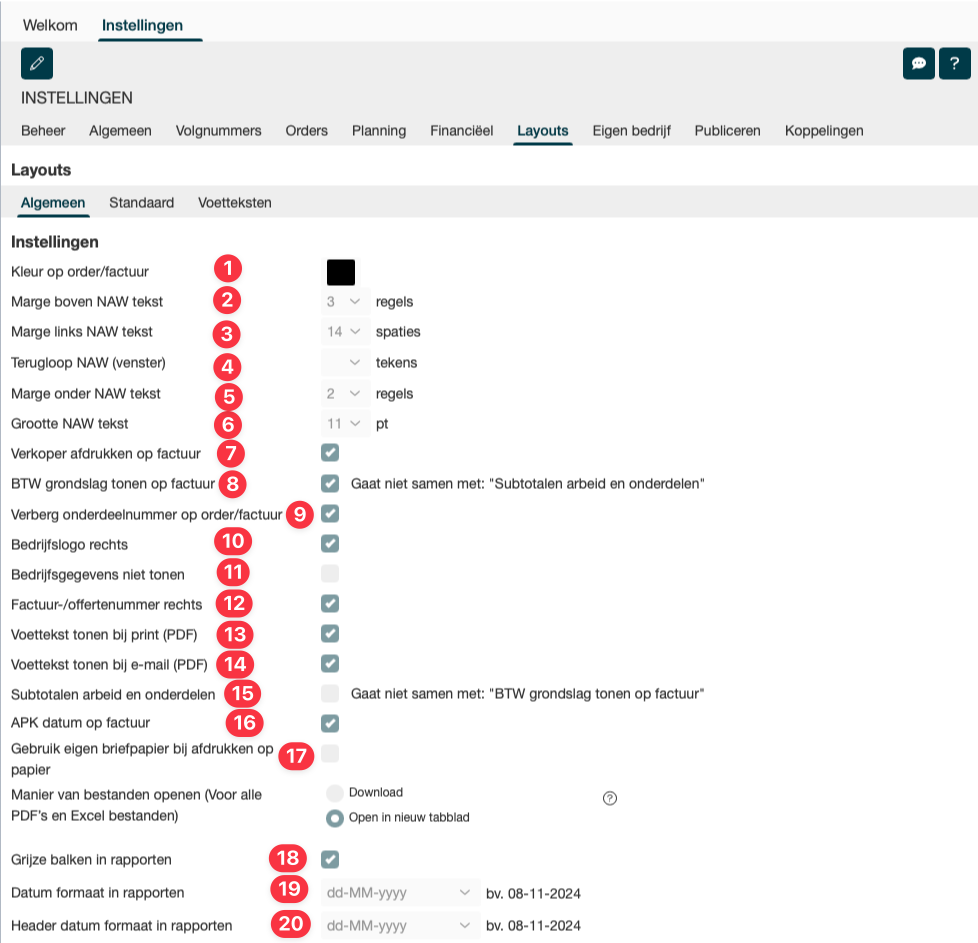 Ja, er zijn een hoop layout punten waar jij invloed op hebt. Op het tabblad Layouts in de instellingen vind je alle velden en opties die jij kunt wijzigen. Hier bepaal je bijvoorbeeld welk briefpapier je gebruikt en of je voorbedrukt papier in de printer hebt liggen.