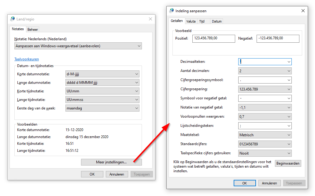 Gebruik je een Windows computer dan wordt gekeken naar de regio-instellingen voor het decimaal teken bij het afdrukken van de factuurbedragen. Staat er een punt in plaats van een komma, gebruik dan de instellingen volgens onderstaand voorbeeld.