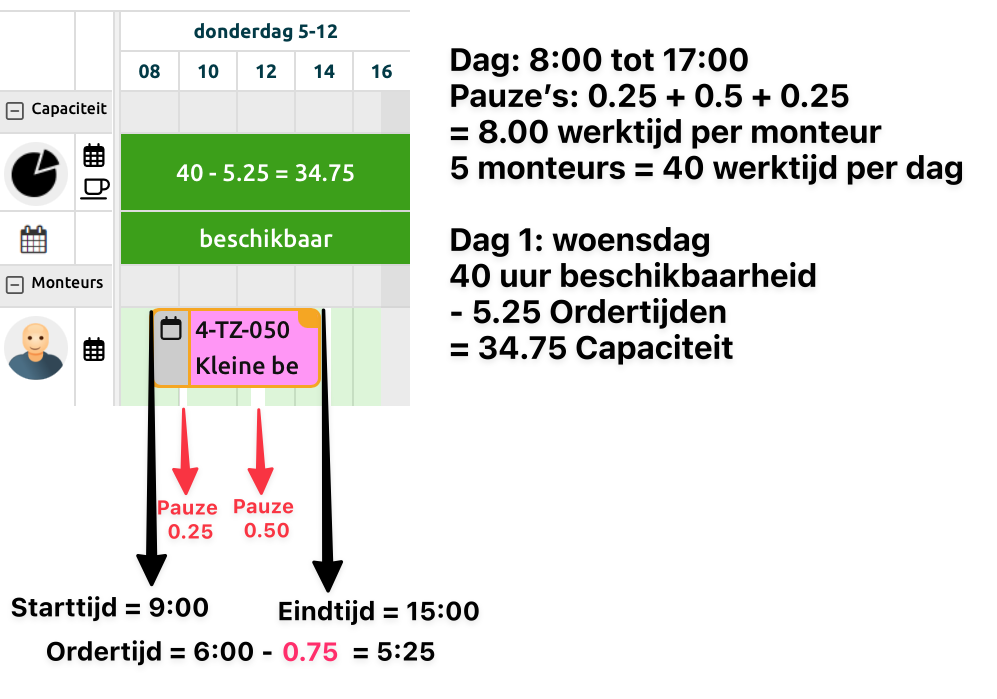 Berekening capaciteit en uitleg voor een | Berekening capaciteit voor een order |