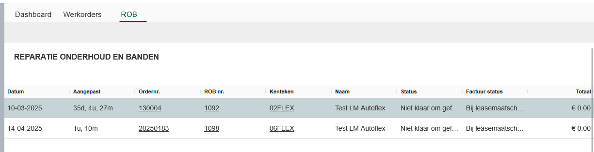 Het systeem voor de administratieve communicatie tussen leasemaatschappij en leverancier op het gebied van Reparatie, Onderhoud, Banden en Vervangend Vervoer. Voor meer informatie over ROB ga naar: ROB NET. Koppel je ROB account aan Autoflex, om efficiënter te werken.