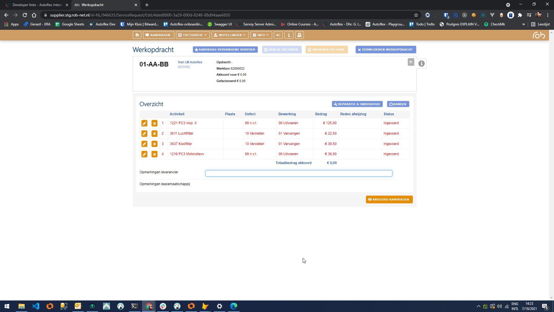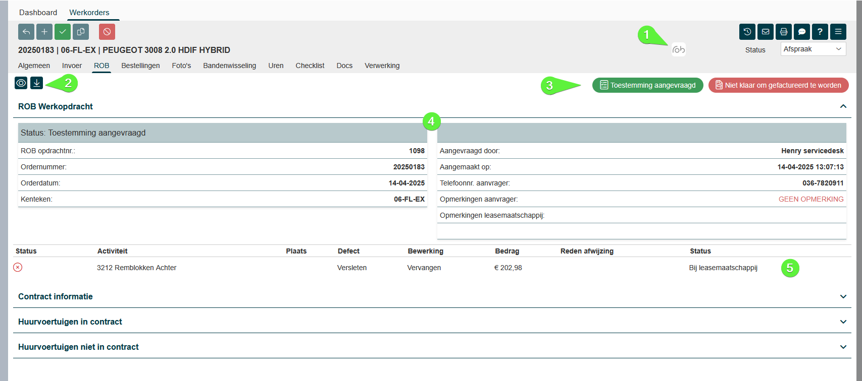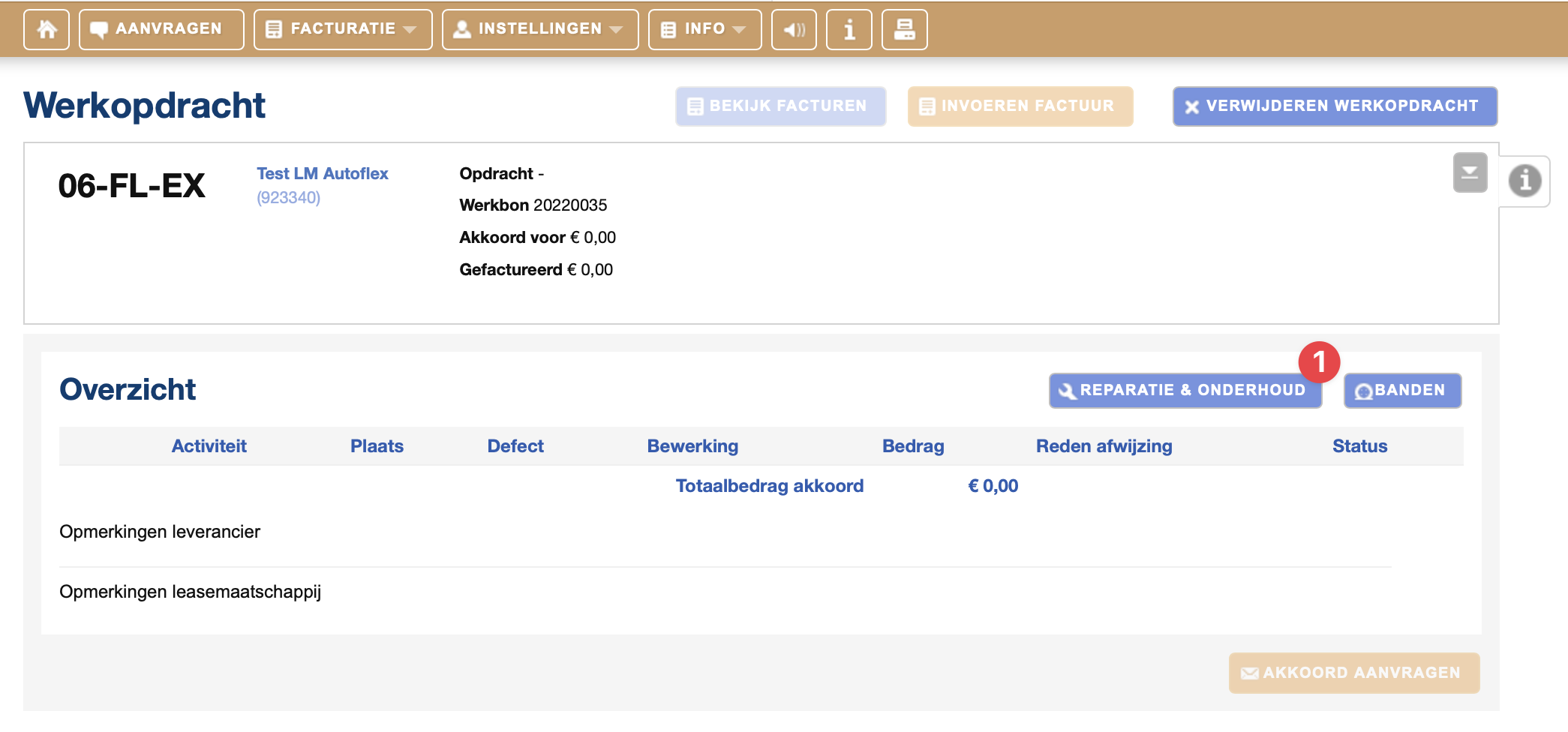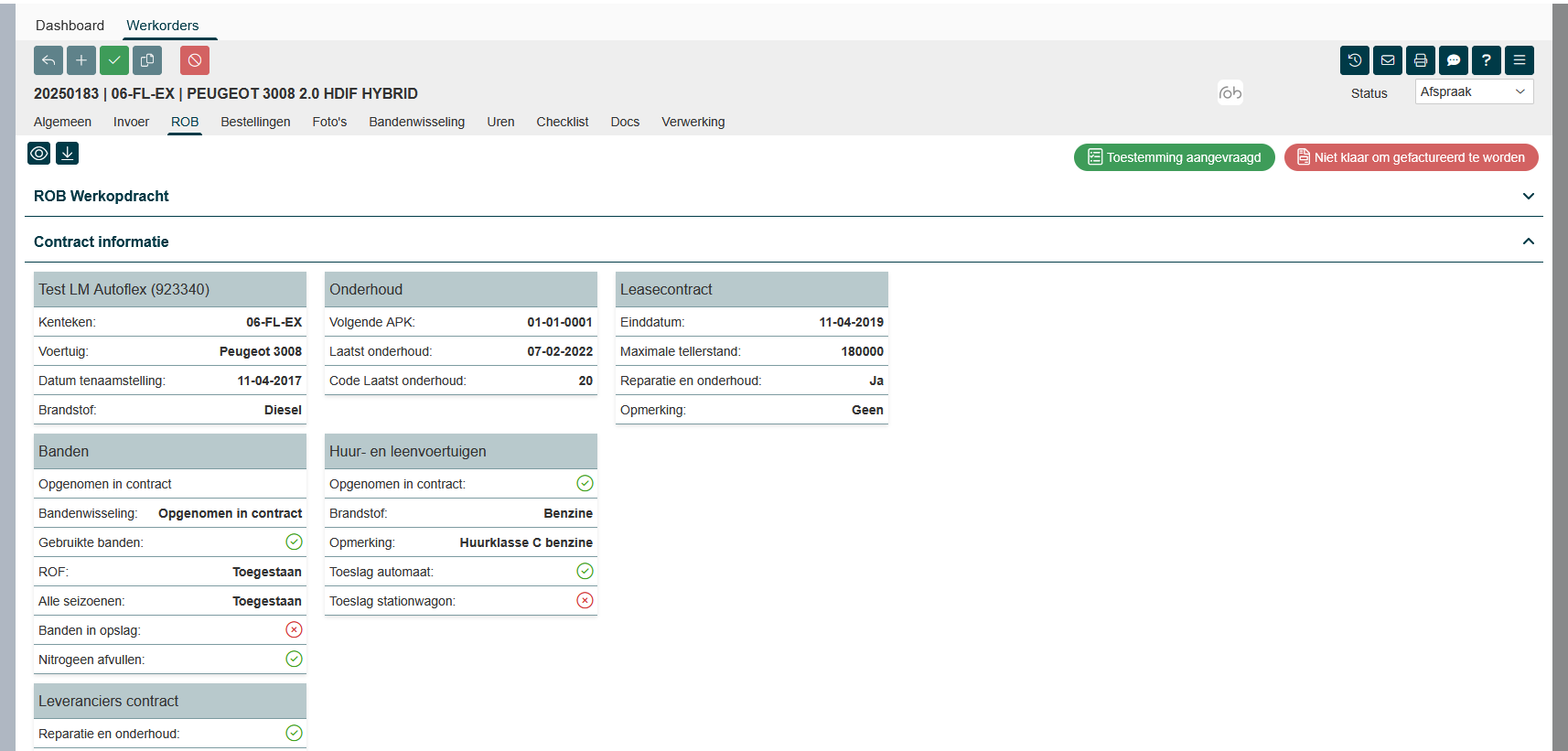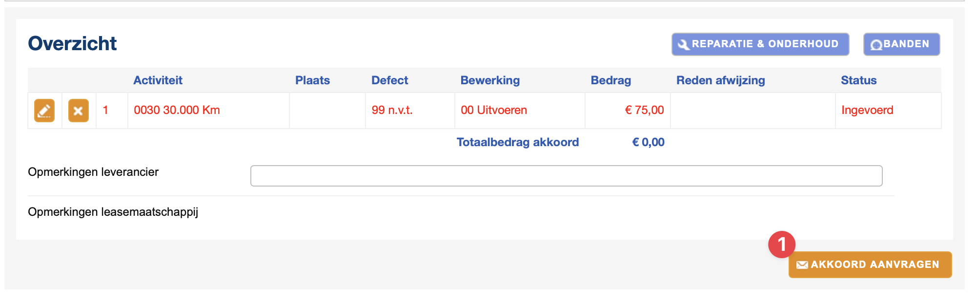 Als de werkopdracht volledig is ingevoerd, wordt er akkoord aangevraagd bij de leasemaatschappij. De werkopdracht is nu klaar om beoordeeld te worden door de leasemaatschappij.