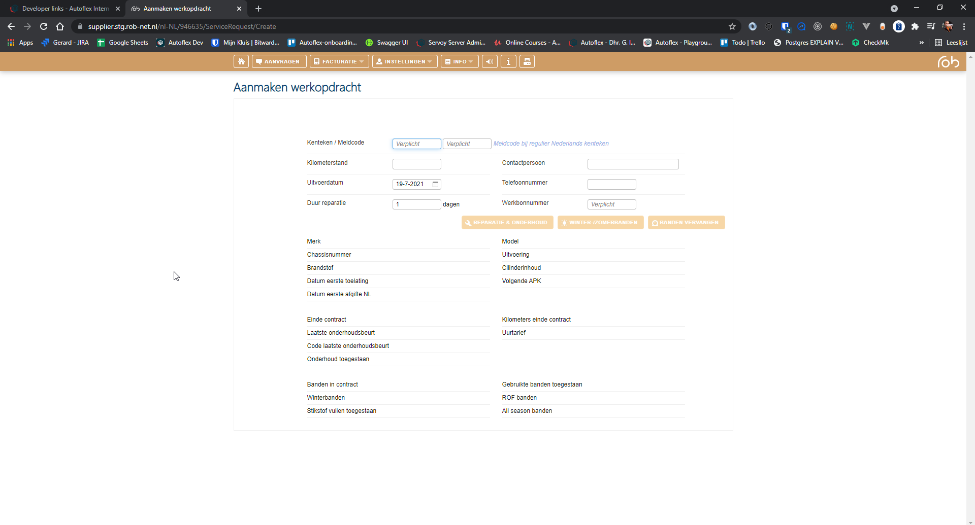 Hierin voert het garagebedrijf het kenteken, meldcode en tellerstand van het voertuig in en het werkbonnummer uit Autoflex (ordernummer).