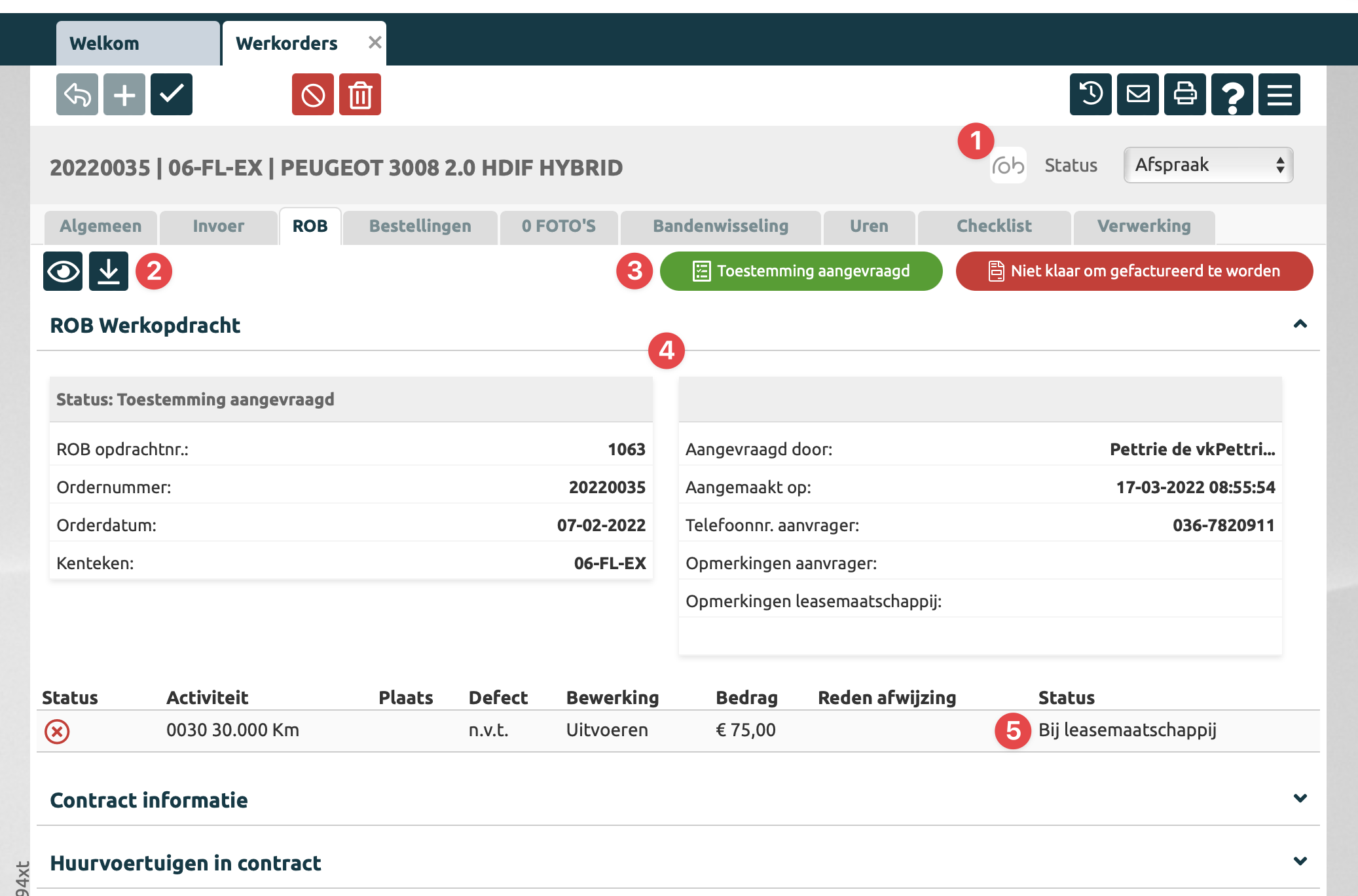Als de werkopdracht volledig is ingevoerd, wordt er akkoord aangevraagd bij de leasemaatschappij. De werkopdracht is nu klaar om beoordeeld te worden door de leasemaatschappij. |