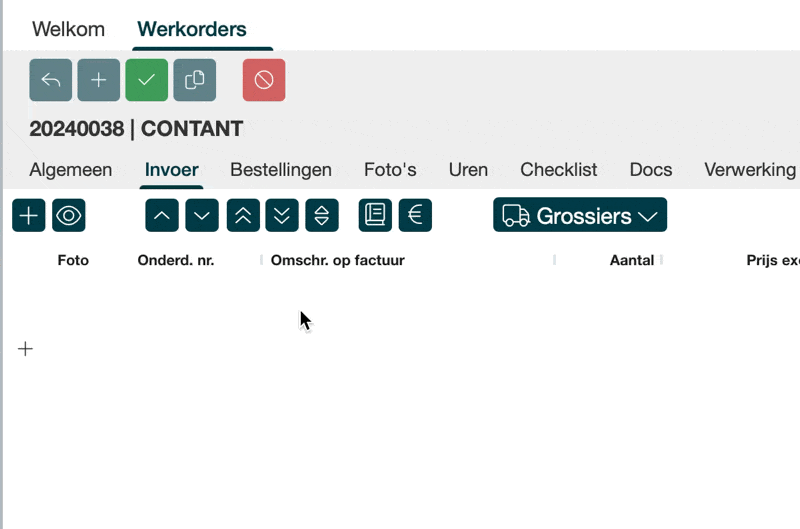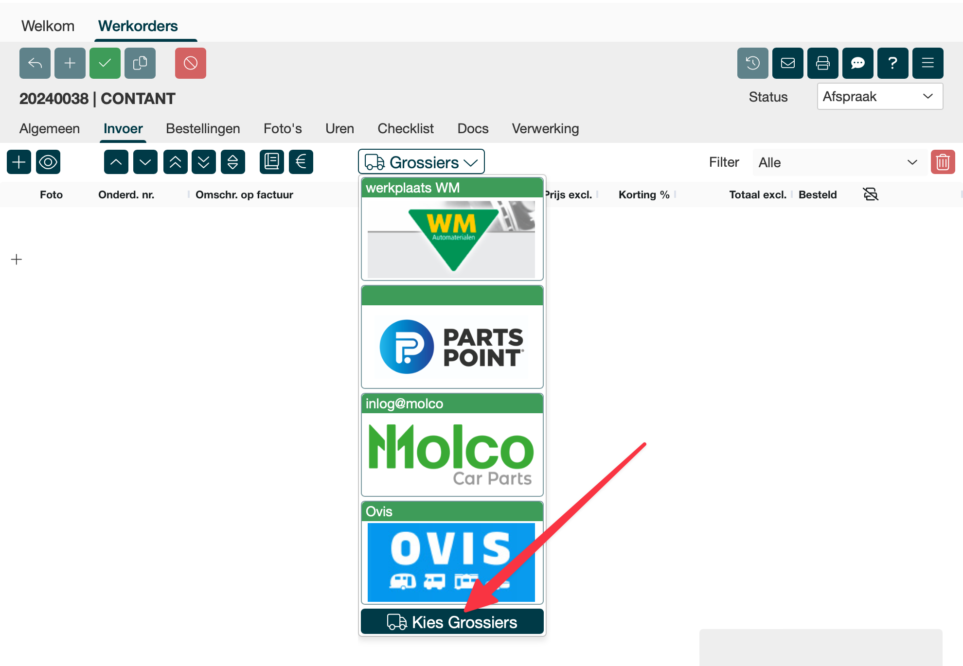 Onder aan de tab invoer in de werkorder staan de logo's van de grossiers die actief zijn, om een grossier toe te voegen zie: https://docs.autoflex10.eu/wiki/x/_jdN9g .