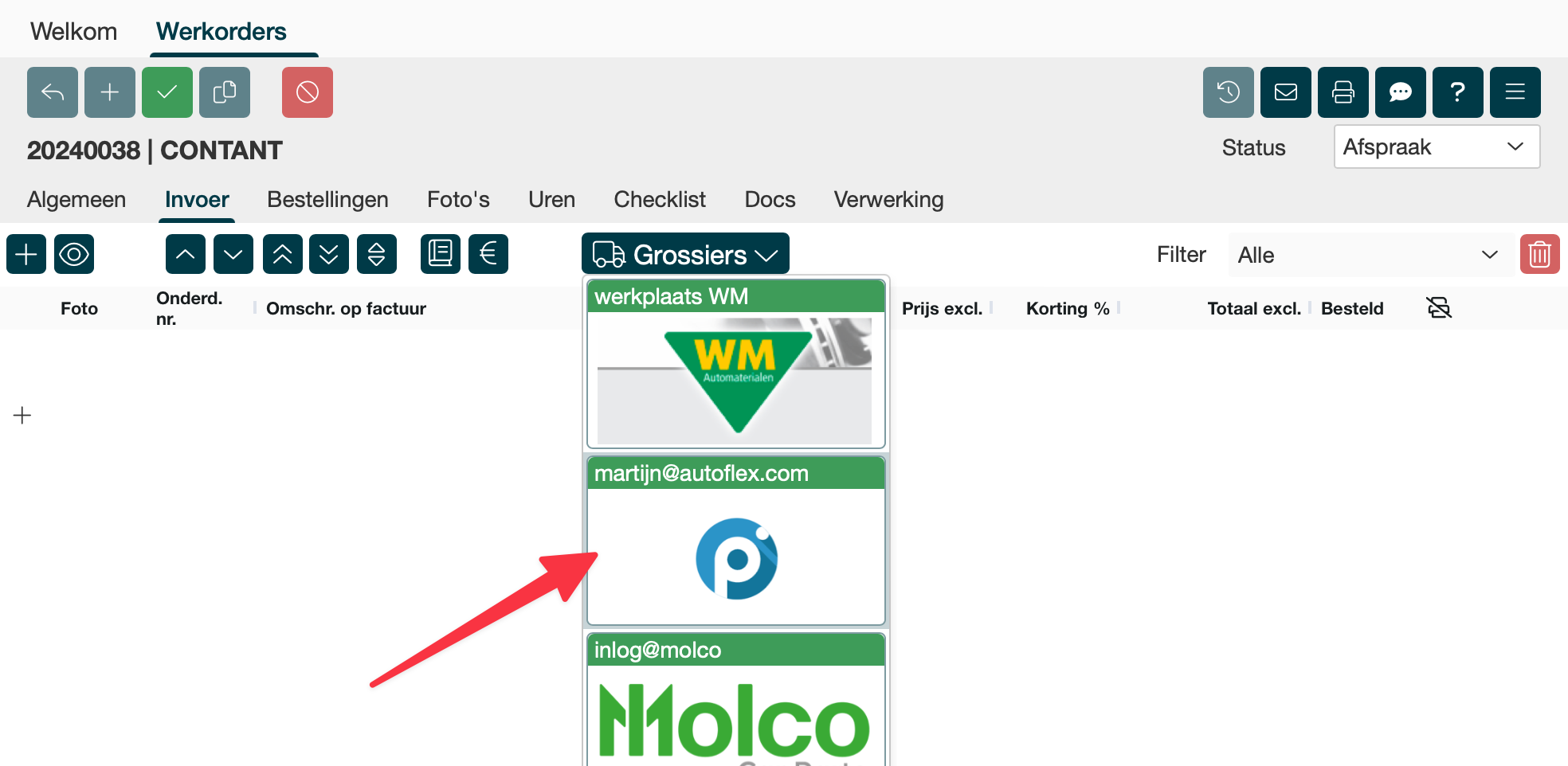 Klik in de werkorder op de grossierskoppeling en voeg alle onderdelen en werktijden toe zoals je gewend bent in het grossiersportaal.