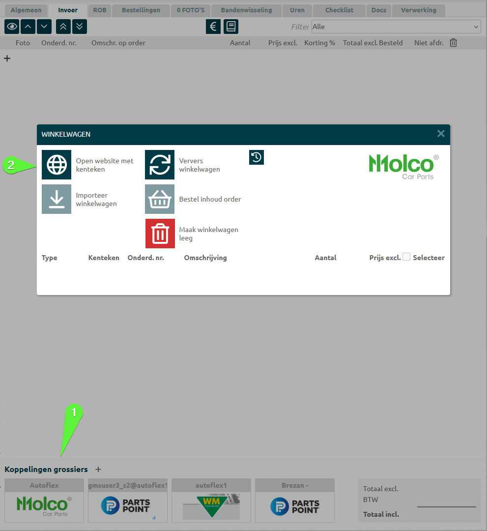 Wanneer je de onderdelen wilt bestellen, klik je opnieuw op de Molco koppeling, je selecteert de onderdelen en kiest voor “Bestel inhoud order”.
