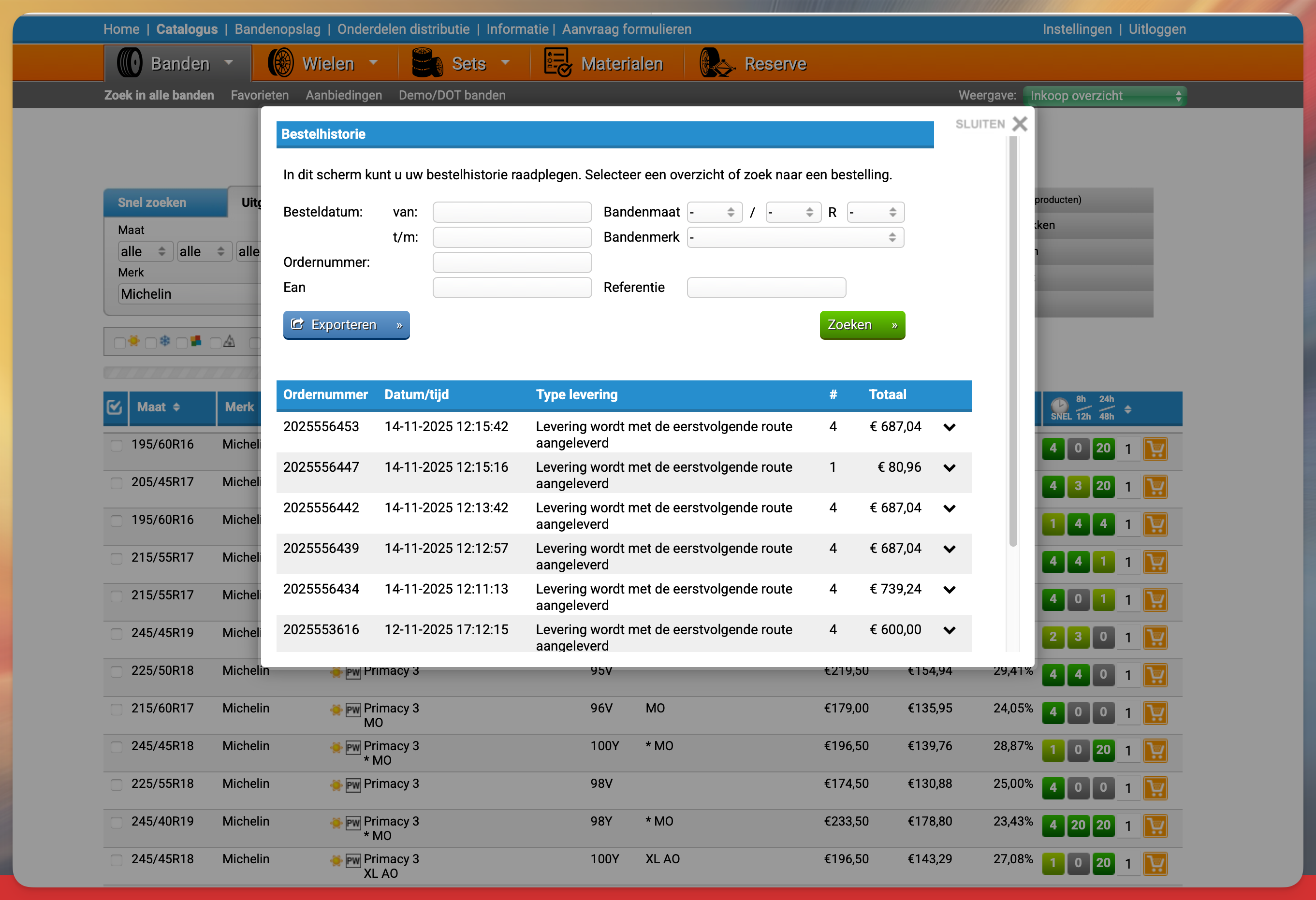 Open Tyrenet via de grossier koppeling en kies de knop; Bestelhistorie om de vorige bestellingen te zien.