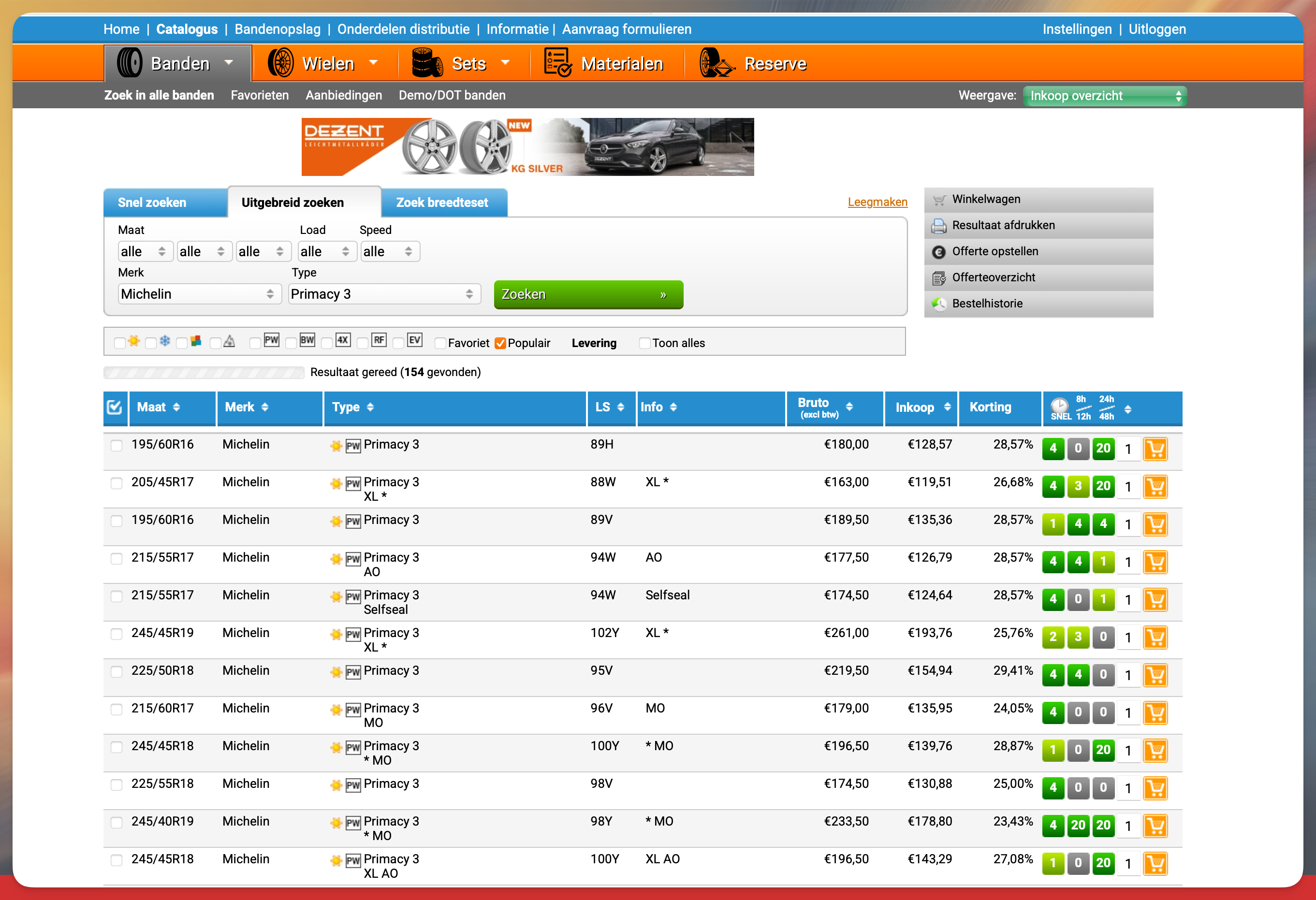 De Tyrenet grossier scherm, hier kun je de gewenste banden zoeken, en ook toevoegen aan het winkel mandje