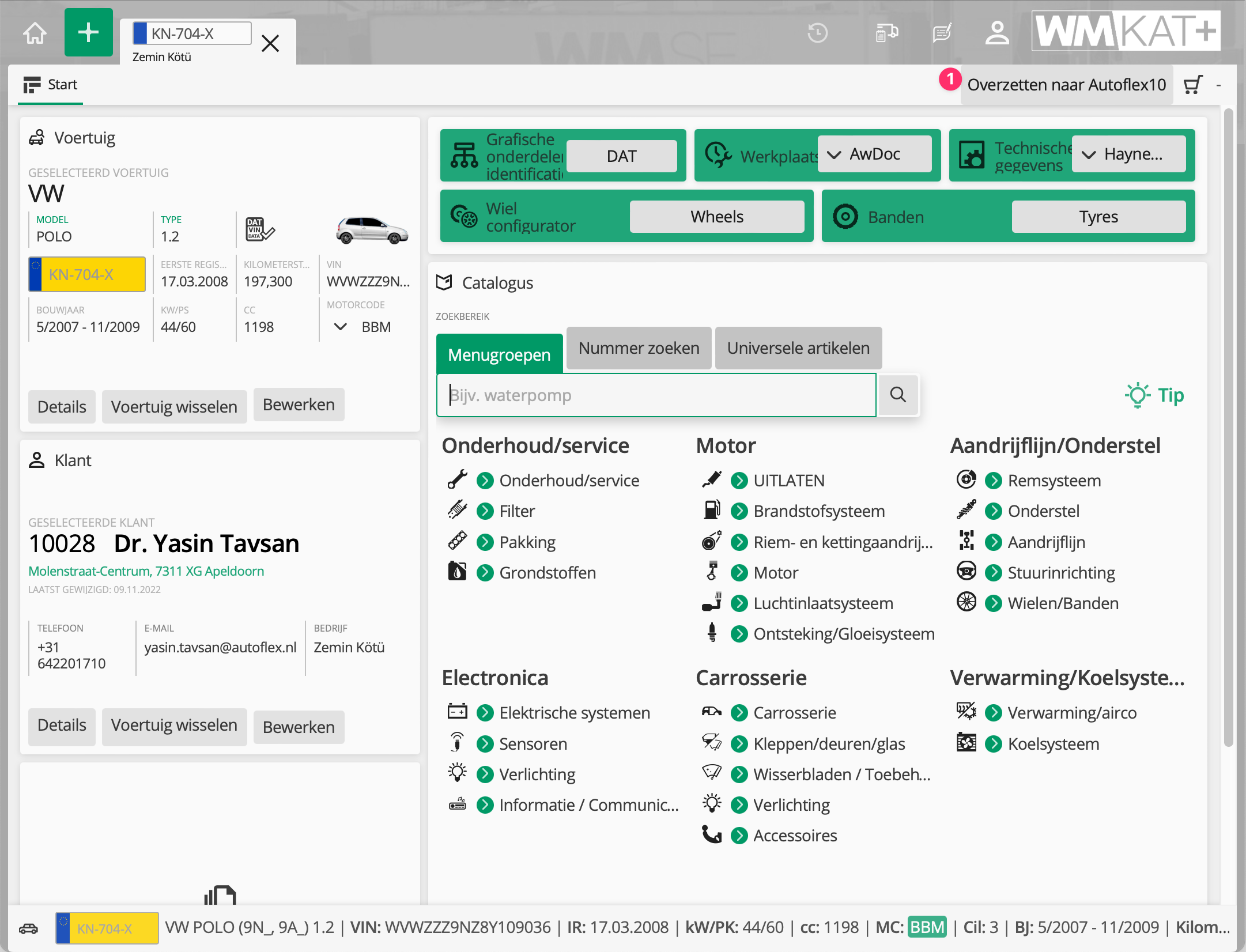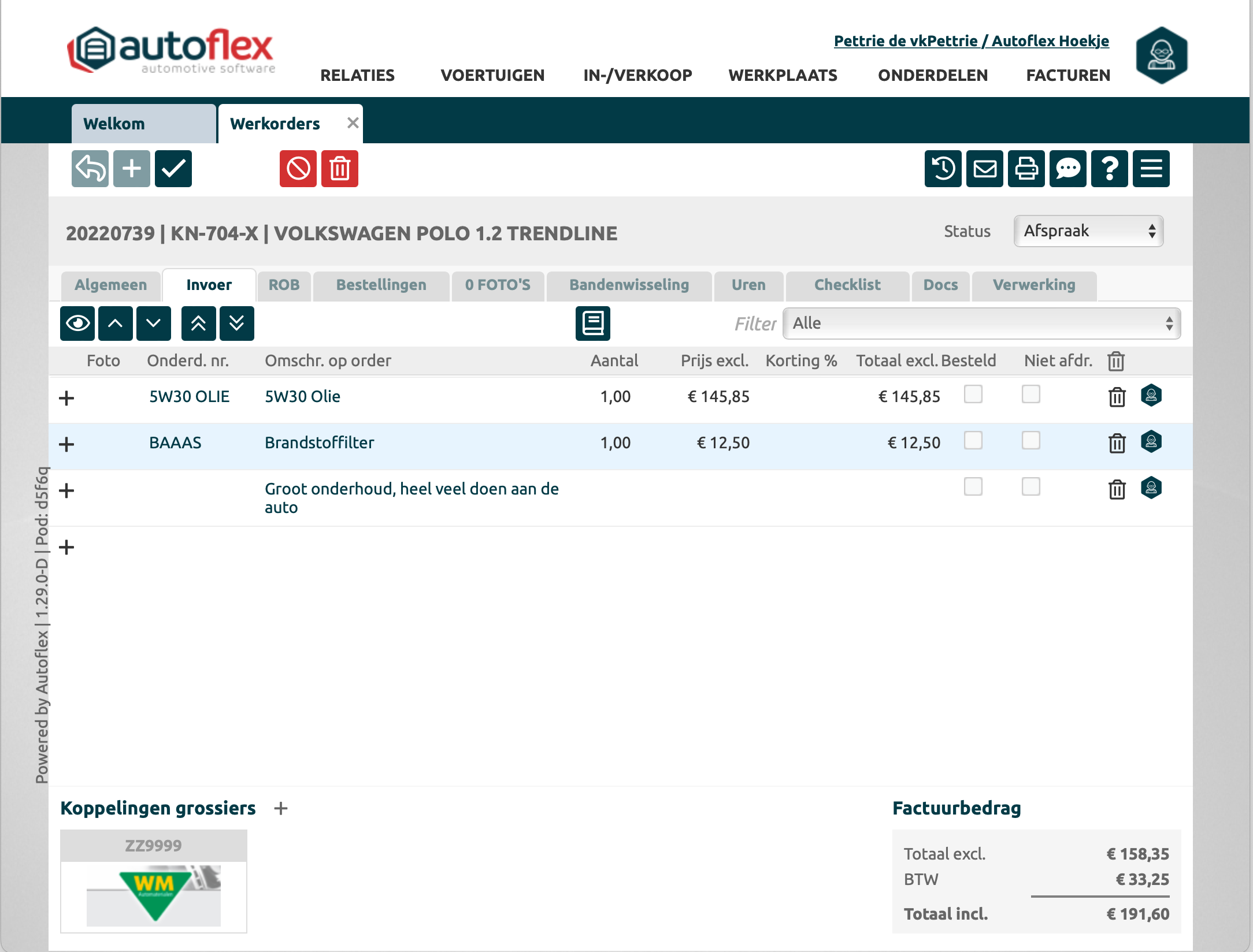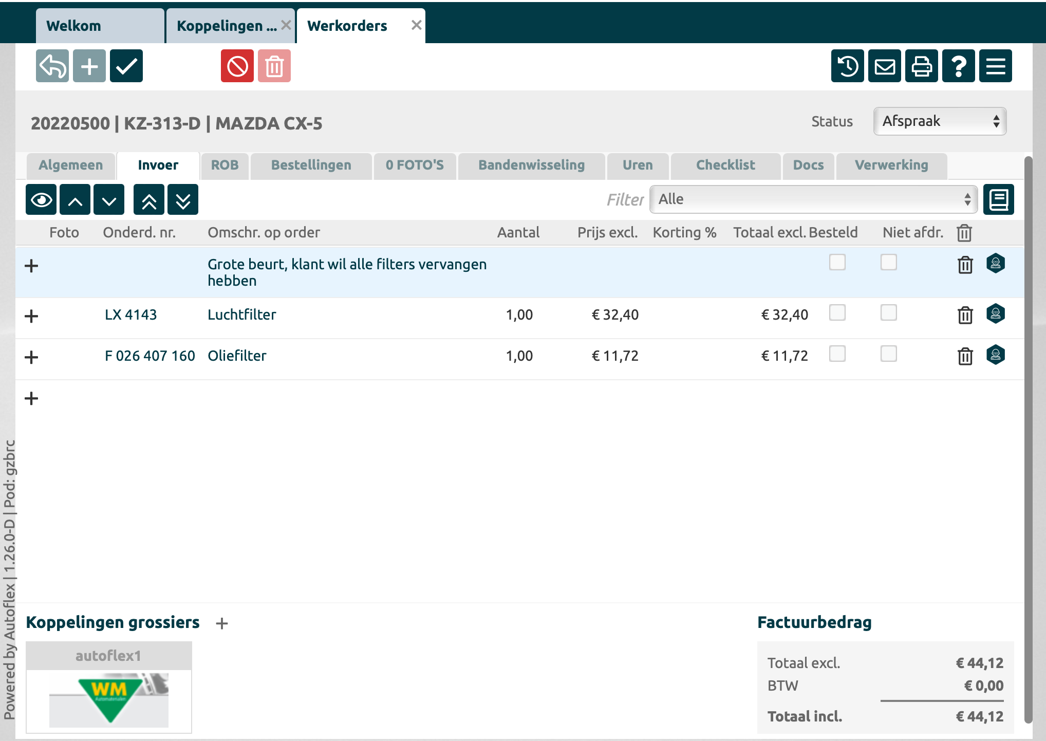 Na het aanmaken van een werkorder kun je bij onderdelen kiezen voor de grossiers koppeling van WMKAT+.