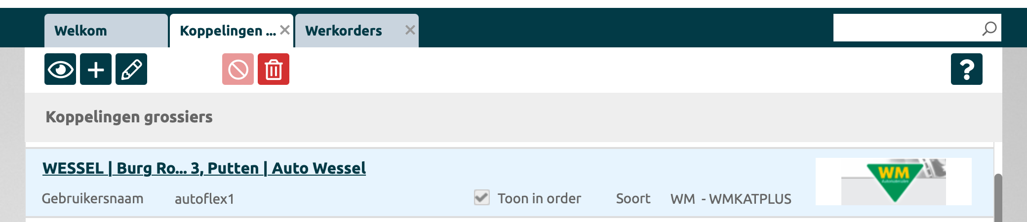 Open het overzicht via: Instellingen → Beheer - Onderdelen → Koppelingen Grossiers