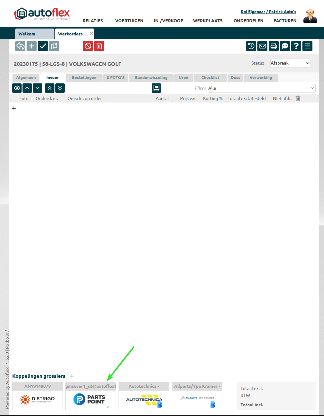 Klik in de werkorder op de grossierskoppeling en voeg alle onderdelen en werktijden toe zoals je gewend bent in het grossiersportaal.